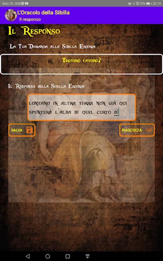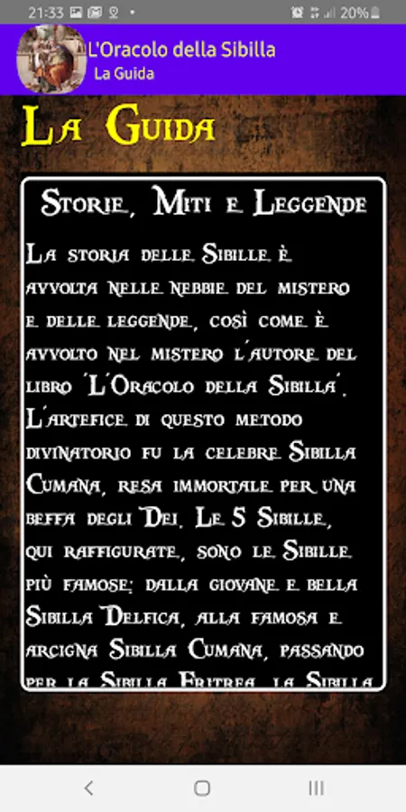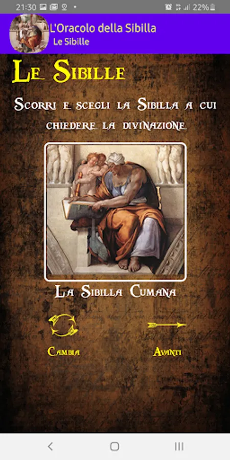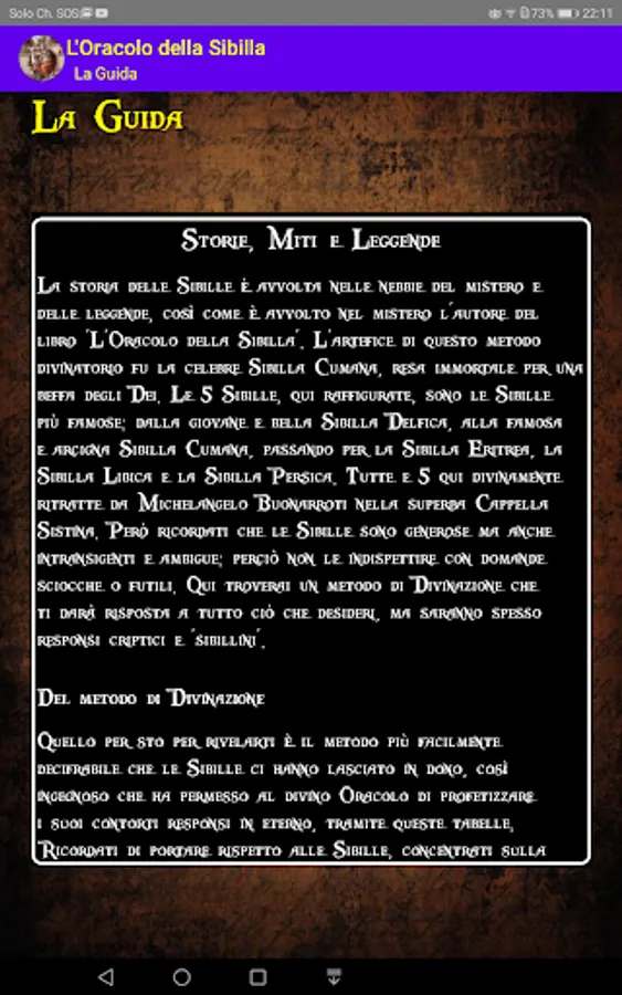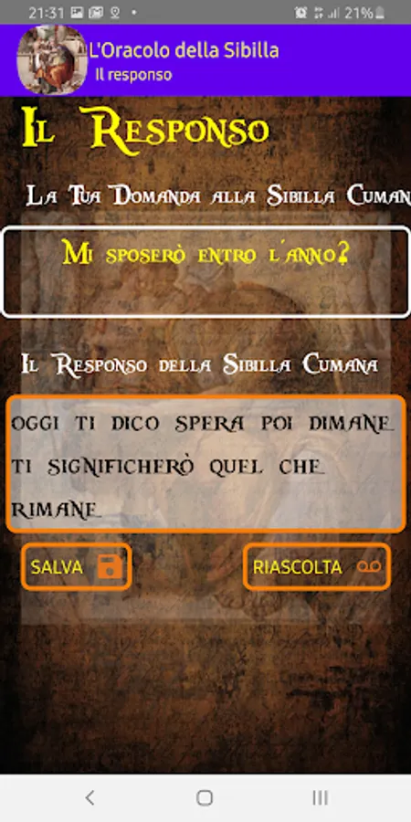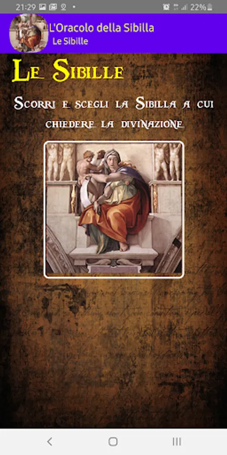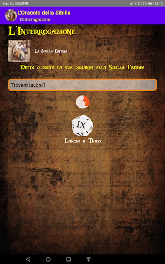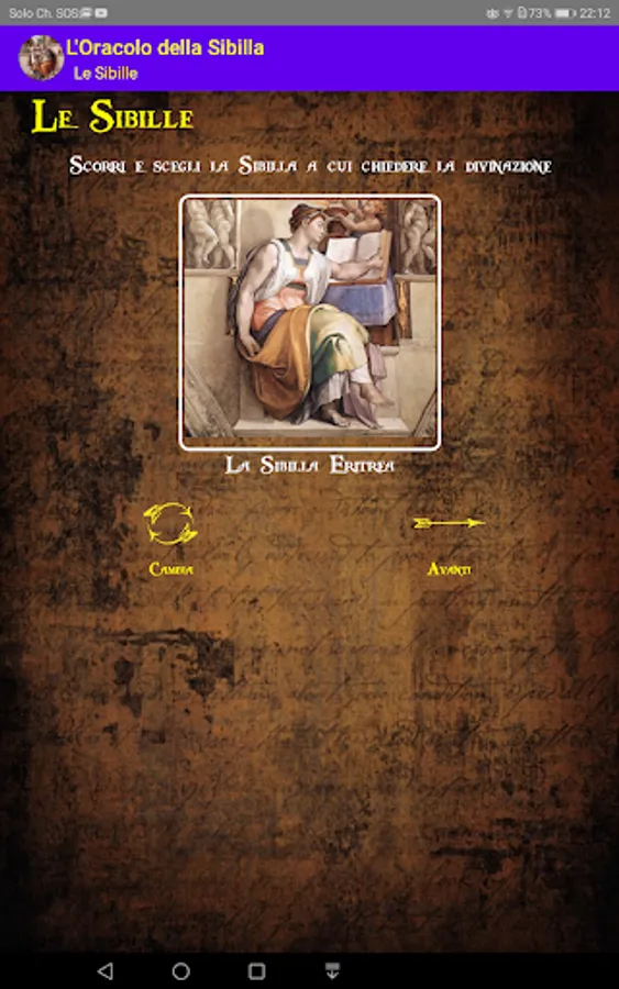 This App is taken from the famous Book "The Oracle of the Sibyl". You can get a response on your future, whatever the question you ask. One of the 5 Sibyls will answer your doubts or questions about the future, yours or those you care about.