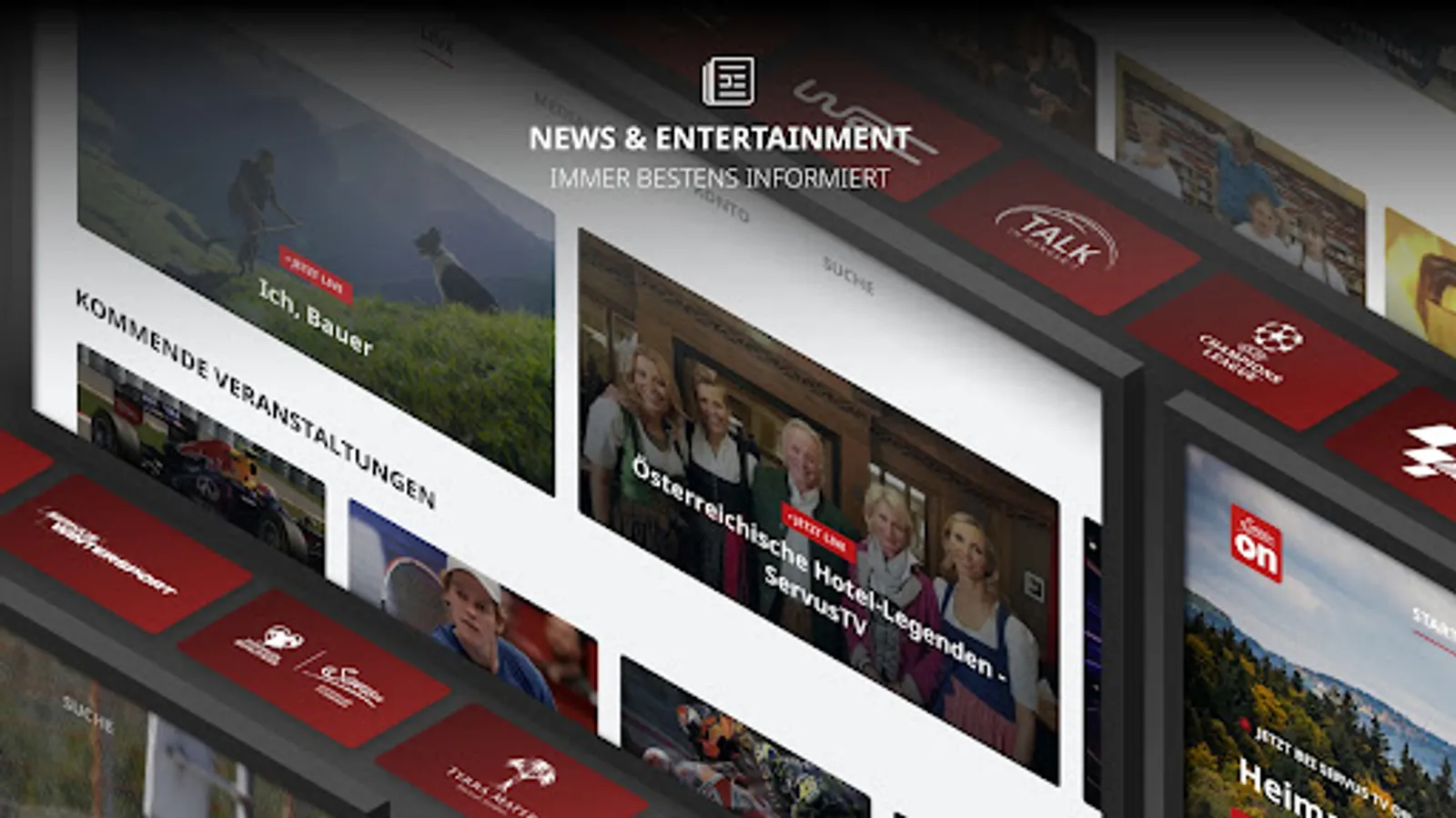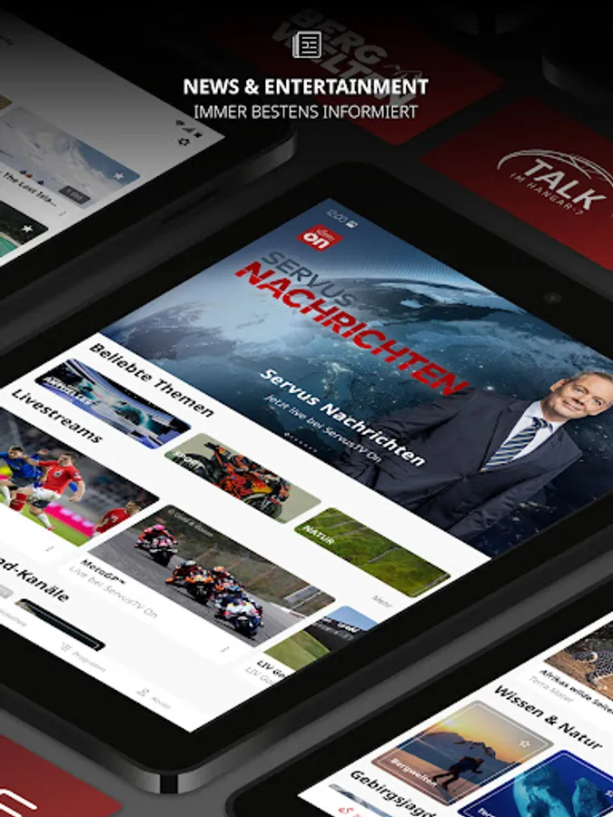 ServusTV On is your platform for streaming. Here you can watch the UEFA Champions League, Formula 1, MotoGP and European Qualifiers for free and from anywhere. Documentaries, films and talk shows round out the range of freely available content. News, reports and the daily weather inform you about what is happening in Austria and the world.
