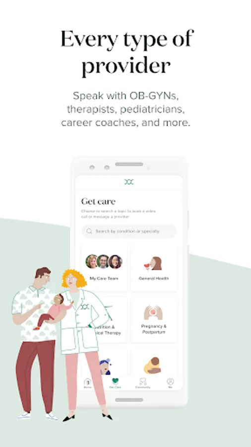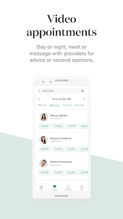 Same-day appointments: Video chat with 25+ types of specialists, like OB-GYNs, fertility educators, infant sleep coaches, and mental health providers.
