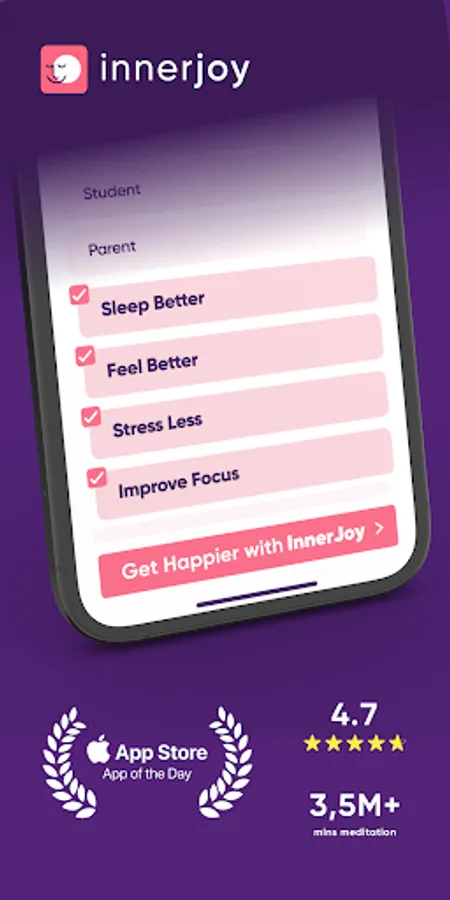 Innerjoy, with its scientifically proven mindfulness exercises, offers you the meditation exercises addressing fundamental issues that you encounter in everyday life, such as family, school, work life, relationships with your environment, inadequacy, difficulty in focusing, high stress, lack of concentration and attention, awareness of life purpose, awareness of yourself and your bodily feelings. It is there to be by your side at every moment to reach a state of mental clarity and balance with a permanent and radical transformation by offering meditation and breathing exercises for those subjects, to reveal the power of joy and happiness within yourself.