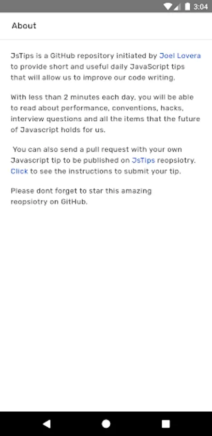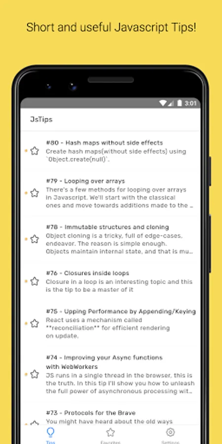 Get short and useful JavaScript tips that will help you to improve your code writing. With less than 2 minutes each day, you will be able to read about performance, conventions, hacks, interview questions and all the items that the future of this awesome language holds for us.