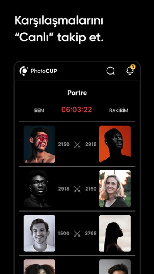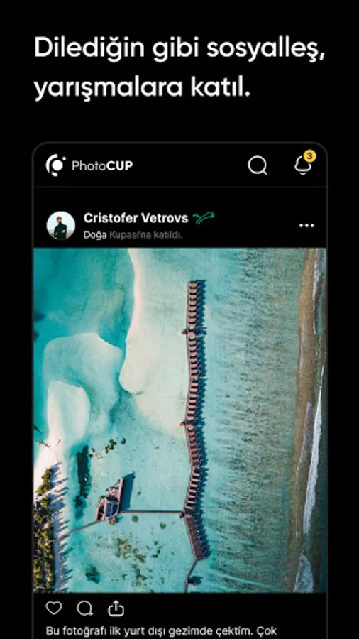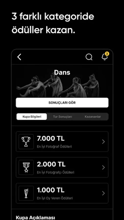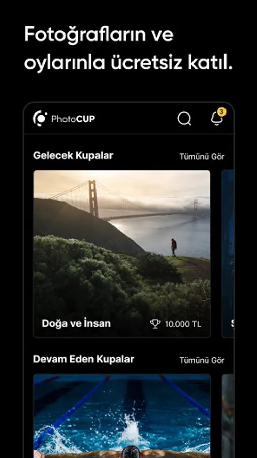 Users participate in photo cups organized at different intervals and in different themes either with the photos they upload or with the votes they give to the photos and win prizes.