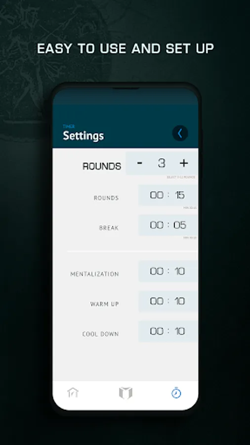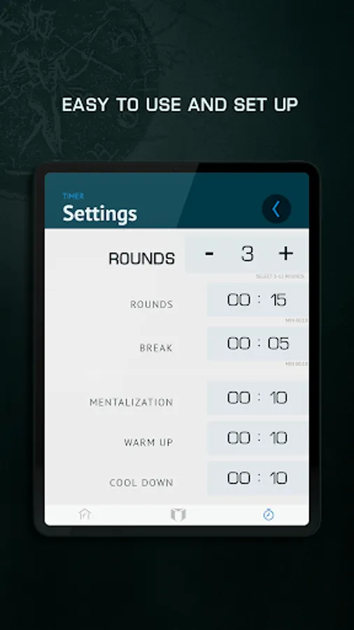 It can be used anywhere (offline) and set up according to your goals, from the beginning to the end of the workout, with the times and intervals you want. You can set up the time of each Round, the number and intervals between them, and you can include Warm Up before the Rounds and Cool Down at the end of the workout. And, to get started, set up a Visualization time to get the athlete into the training/combat mindset.