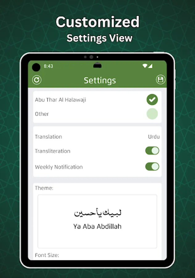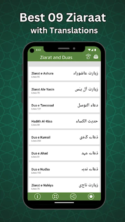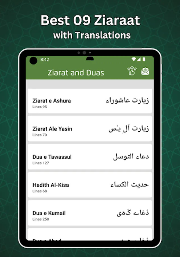 The layout is simple and easy to navigate, all ziarat and duas are available with no restriction. Each ziarat and dua is translated into English with transliteration for better understanding and reading. You can read ziarat e warisa, ziarat e ashura and all of other duas without having any internet connection.