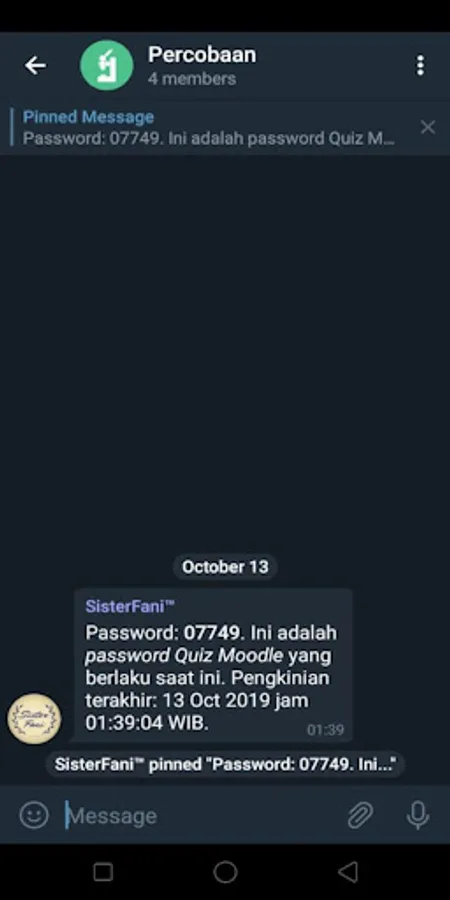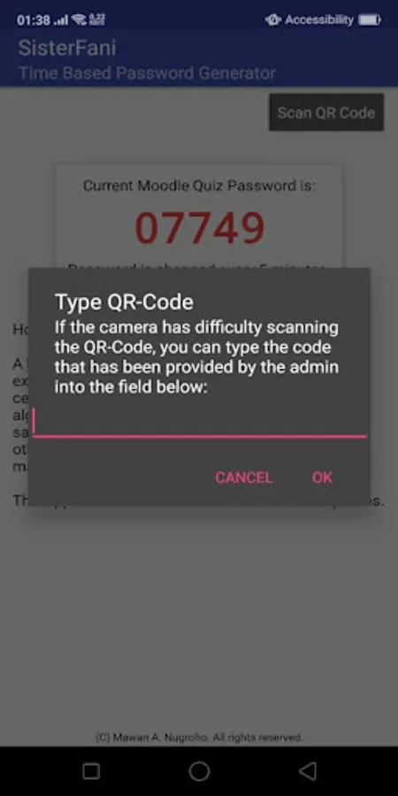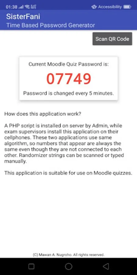This application is for SMK PGRI 1 Tangerang and SMK Negeri 1 Tangerang, but can also be used elsewhere as long as the algorithm is the same. The function of this application is to display a password quiz that changes periodically. In addition to this application, it also requires a PHP script installed on the server. The PHP application on the server functions to change the password stored in the database to match the code generated by this application. It is suitable to change the Quiz Moodle password or to be used as an additional one time password to log in to a website.