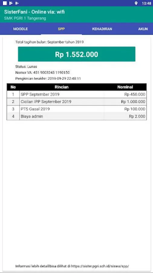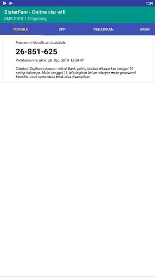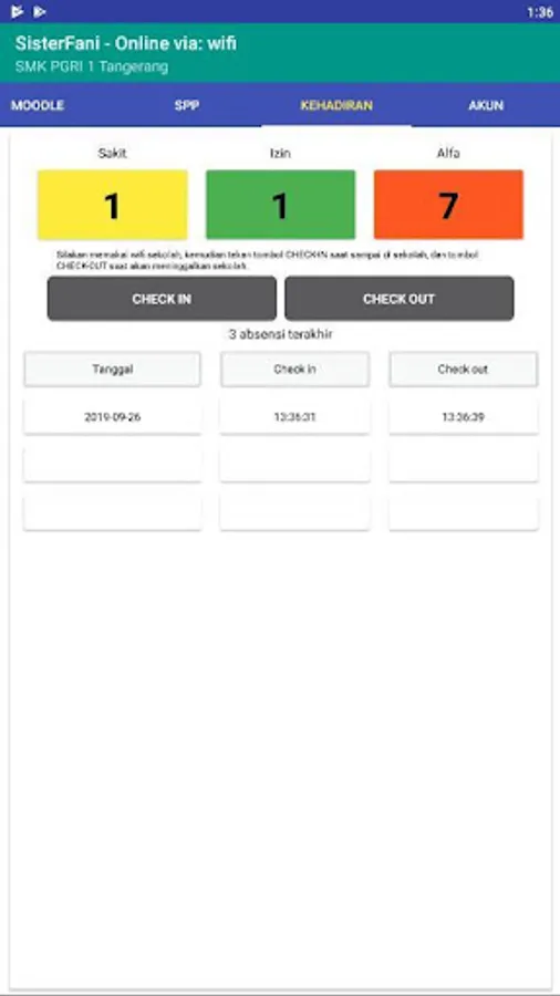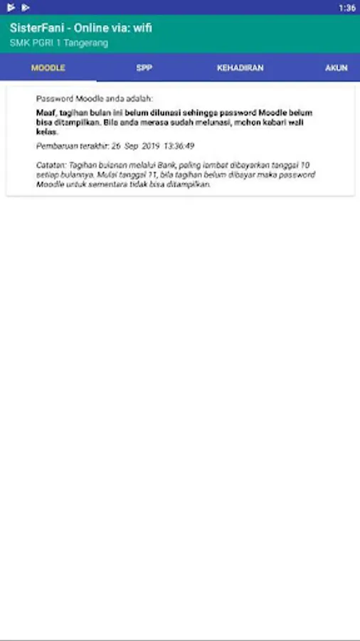 SisterFani application for students of SMK PGRI 1 Tangerang, which includes: Moodle Password, Bank Monthly Bill, and Attendance. Designed to work when the phone is online (offline) and offline (offline). When in an offline state, the data displayed is data stored in a mobile cache (cache) of the phone.