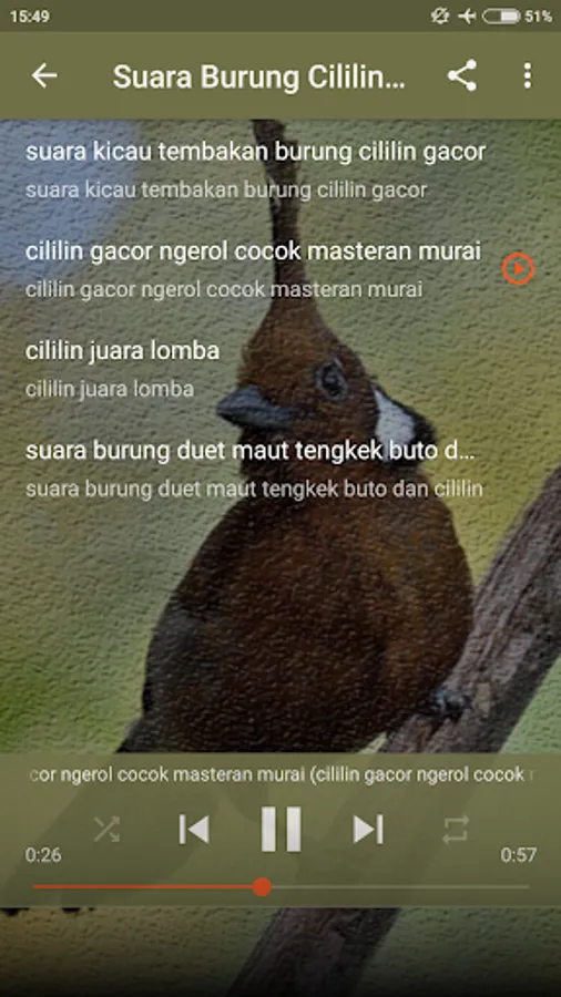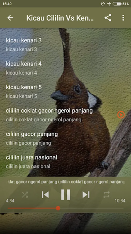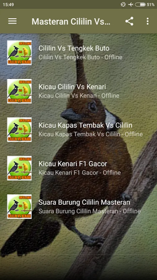 Masteran Cililin Vs Kenari Gacor: the best bird singing duet between Cililin and Walnuts. Come on, bird and canary bird lovers, please move closer. In this one application there is a collection of the best bird song duets between chirping of chirping birds and chirping of canaries. The offline Cililin Vs Kenari Gacor Masteran application can be run without having to be connected to the internet so that it saves data packages.