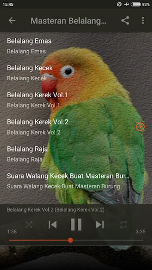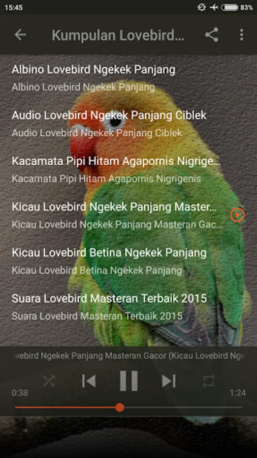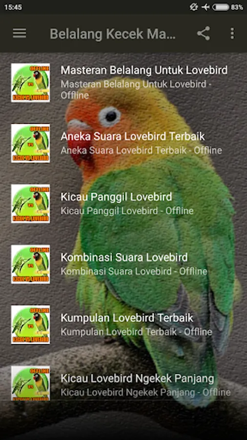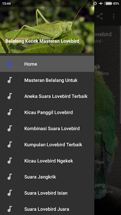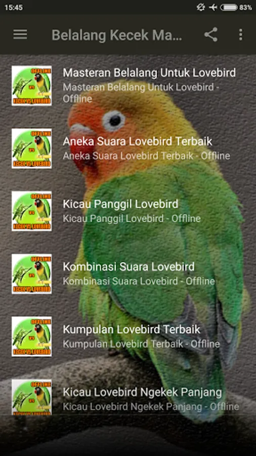 Grasshopper Kecek Masteran Lovebird telling: the sound of grasshopper for master lovebird birds. For fans of lovebird birds, you can install this application. In this app contains a collection of sounds of grasshopper masteran lovebird telling and effective for champions. The voice application of Grasshopper Kecek Masteran Lovebird can be played offline without having to connect to the internet network, so it is very easy, hassle-free and saves data packages.