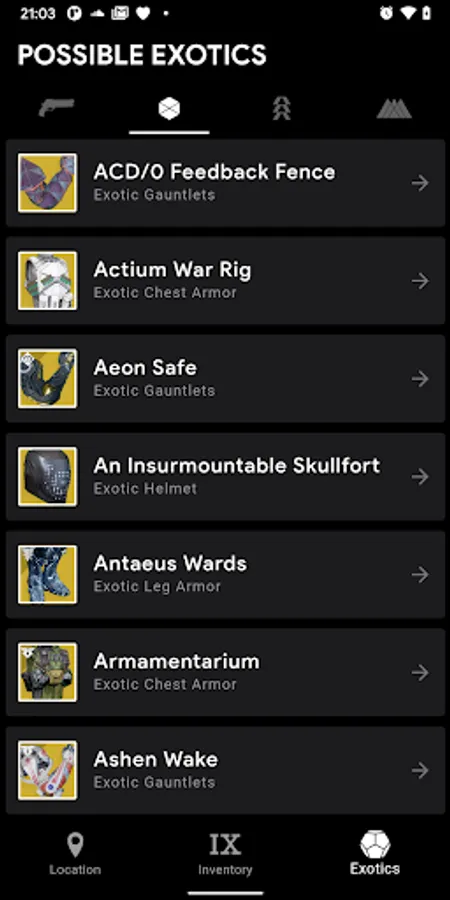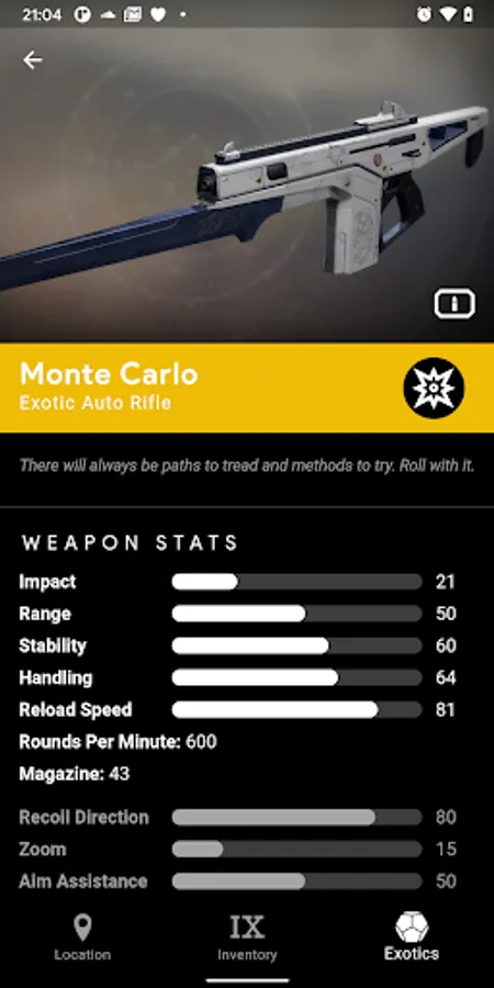 • Inventory with detailed information about every item Xur is selling including weapon and armour stats.