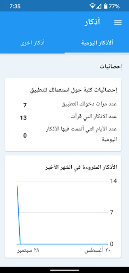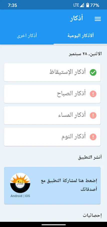 - التطبيق يعطيك إحصائيات حول استعمالك للتطبيق, مما يساعدك على المداومة على قراءة الأذكار