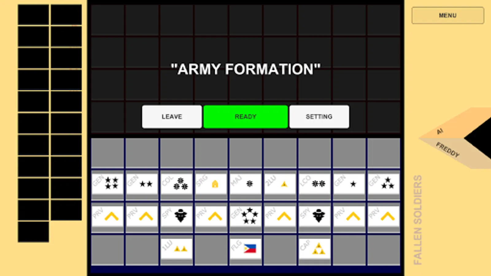 Game of the Generals is a turn based-game that is in a lot of ways, different from any other strategy games. Device your own battle formations and strategies to defeat the unseen enemy ranks. There is no one-for-all strategy that can beat anything. Use deceit and manipulation to break down enemy lines or, gather up your strongest troops to strike the heart of the enemy.