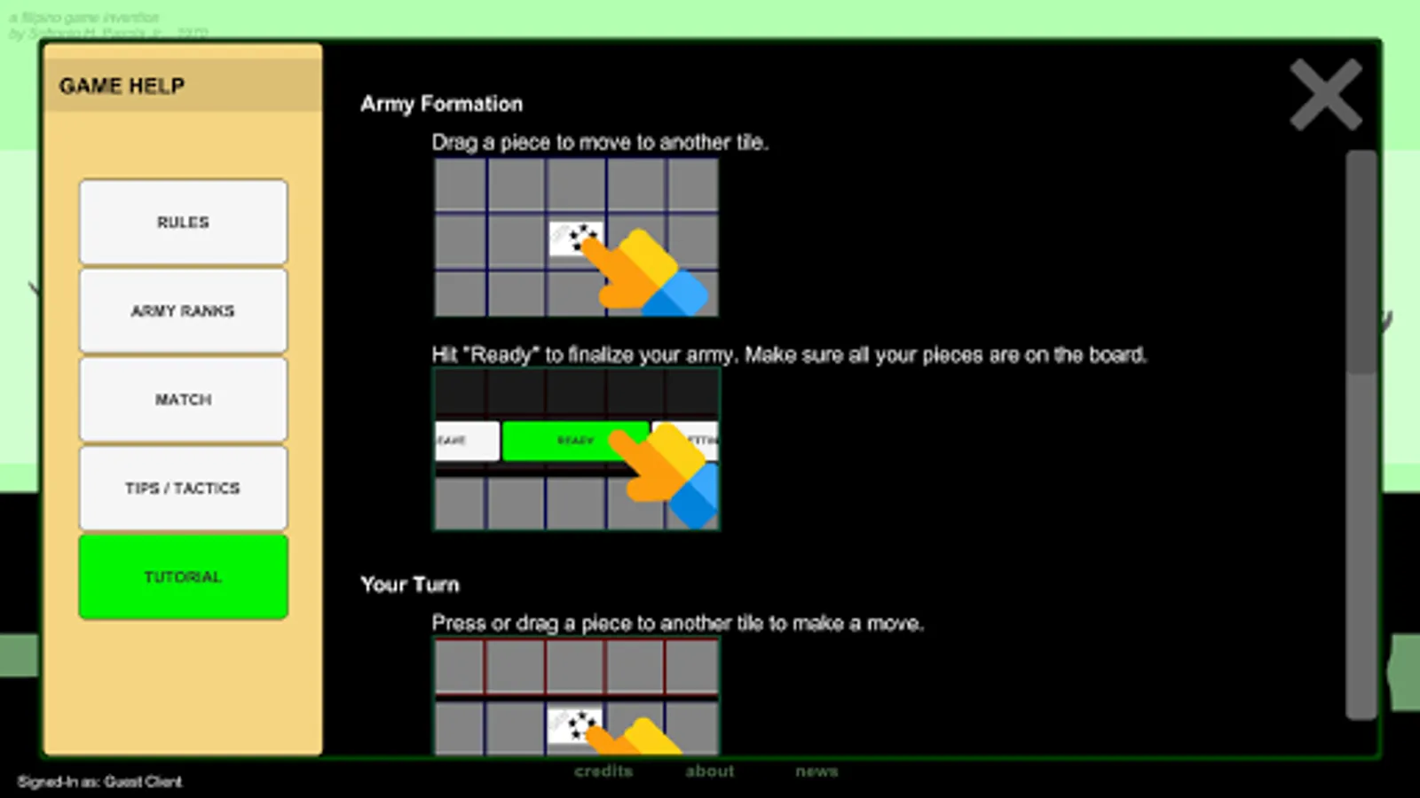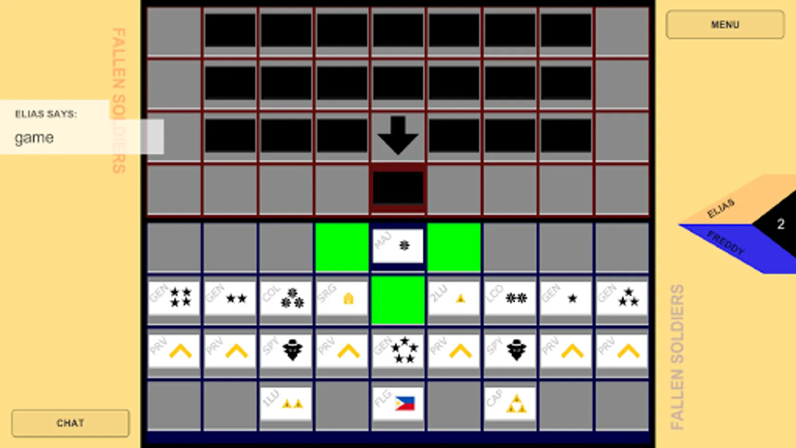 Comes from the original board game, "Game of the Generals", GG is a strategy game designed for two players. Each player will control an army that has their individual identities "hidden" from the opposing side. The only way to win is to use your own logic, memory, deductive thinking, and psychological prowess.