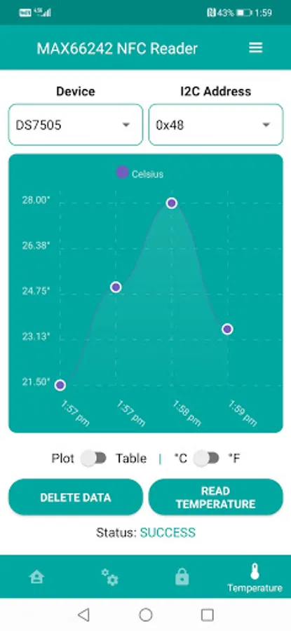 In addition to the RF interface, the MAX66242 also has an I2C interface that allows you to read temperature via DS7505 and MAX31875 sensors. Store and display previously read temperature on graph.
