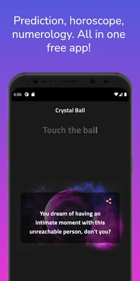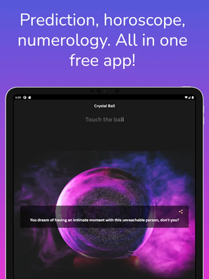 The clairvoyance ball will reveal your future to you. If you are wondering about your life, friends, future, past, then don't hesitate anymore and try this application it will reveal everything to you.