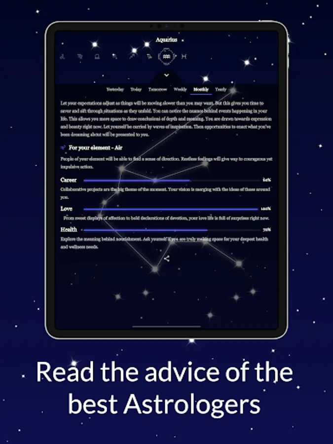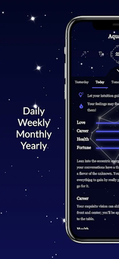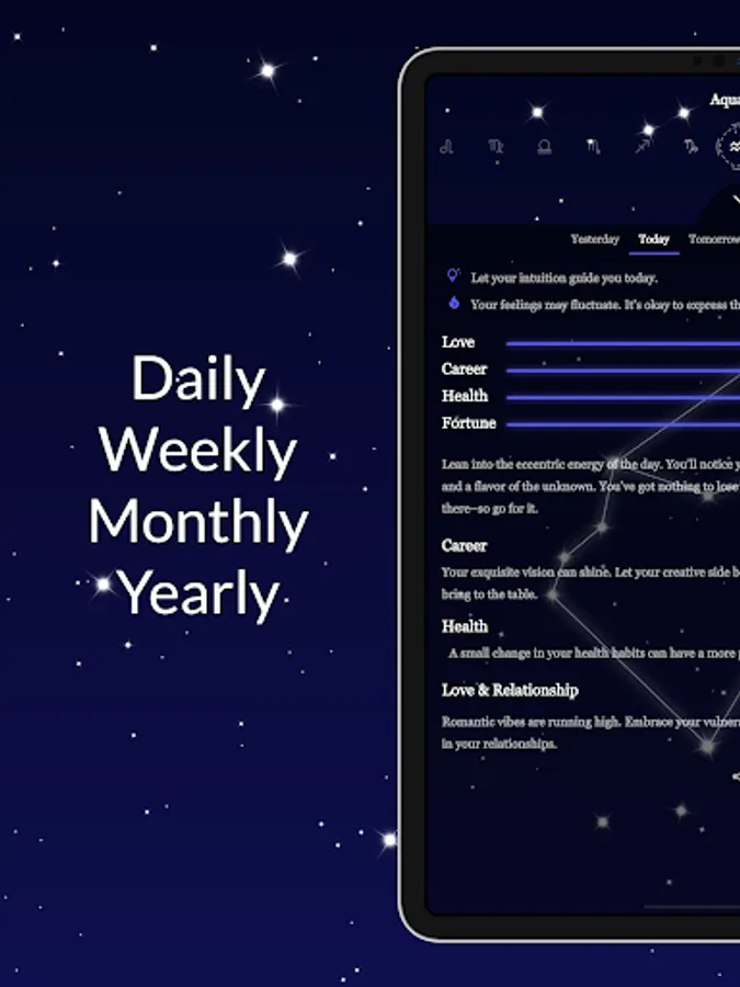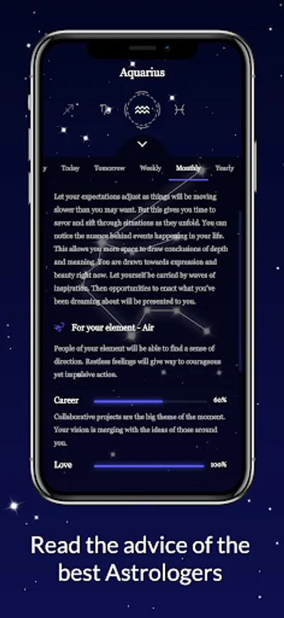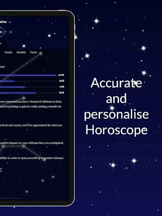 With StarMate you can consult your daily Horoscope but also weekly, monthly and yearly Horoscope. It will give you a large panel of predictions including love, relationship, career, finance and well-being.