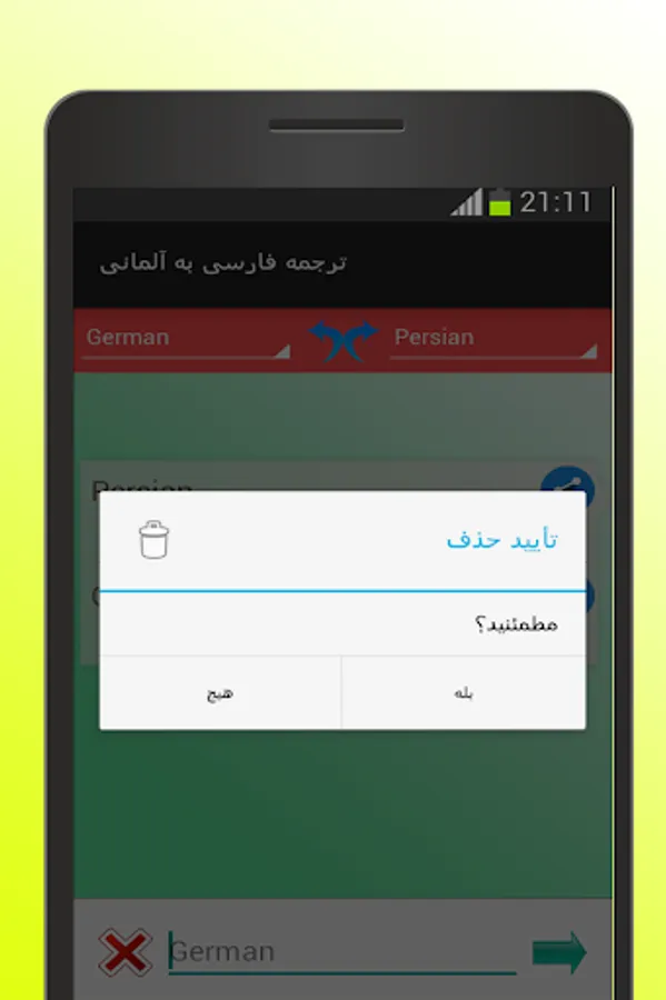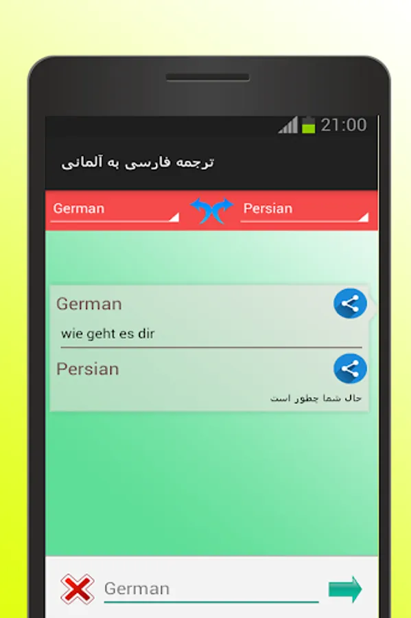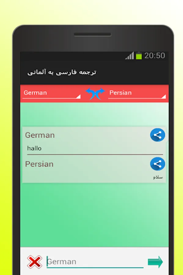 This free application is able to translate words and text from Farsi to German and German to Persian.