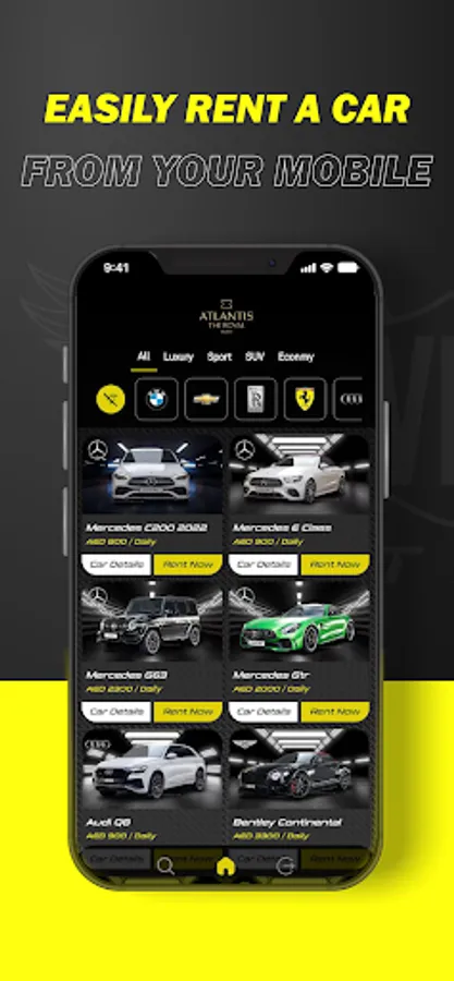 Explore a comprehensive list of luxury cars for rent in the UAE and pick the one that suits you best! Our inventory is selected from ideal models for you to enjoy every ride with utmost confidence. Download this app, scroll around hundreds of recommended car models, and get to know each one's power specifications, color, seats, interior, and exterior features in no time! With us, your dream car awaits at your fingertips.