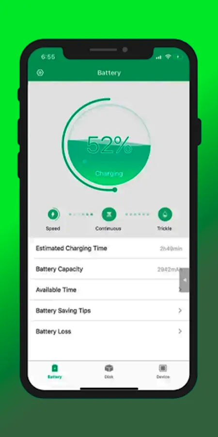 The smart charging app shows you real-time battery information such as temperature, voltage, capacity, battery status