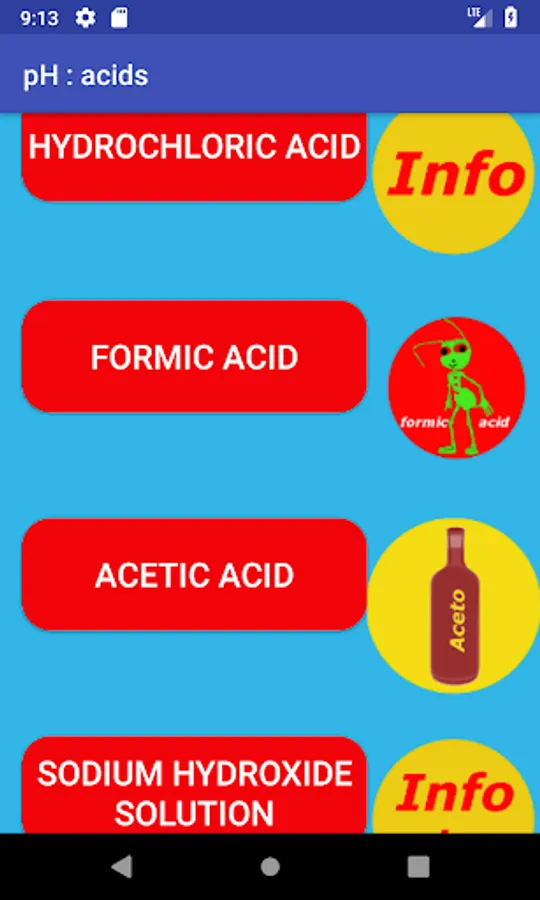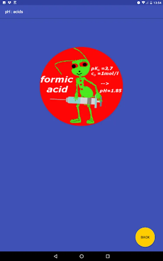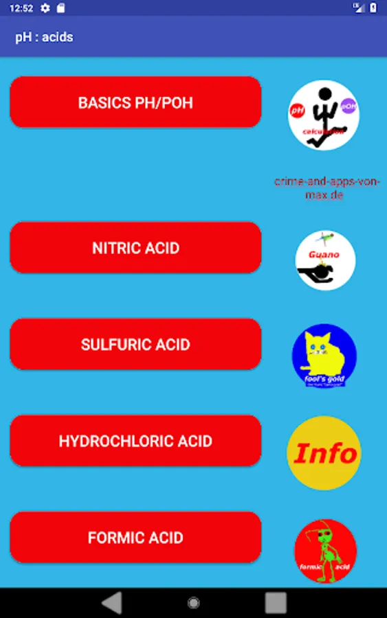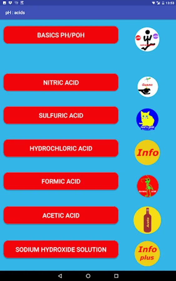 This app gives information about a couple of strong and weak acids and bases such as hydrochloric acid, nitric acid, sulfuric acid, acetic acid, formic acid, sodium hydroxide and ammonia solution.