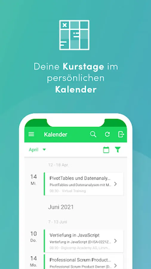 * Behalte die Übersicht über all deine besuchten Kurse und organisiere deine Kurstage mit der Kalenderfunktion.