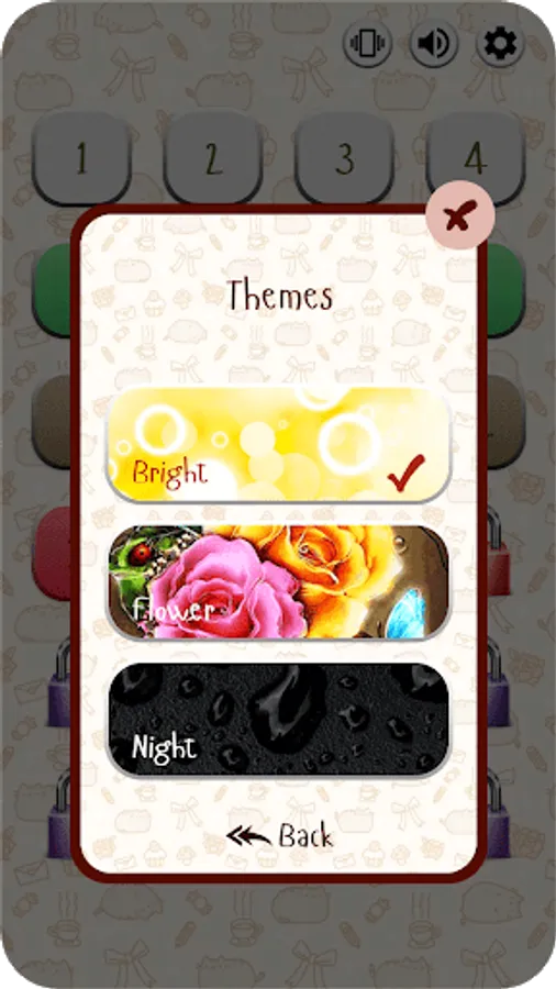 You will never get tired of the monotony, as the design and theme of the pictures change every few levels. There are also three colorful themes for every taste: bright, floral and dark. Every 8 levels, the color of the cards and the background changes, which makes this mahjong it not dull.
