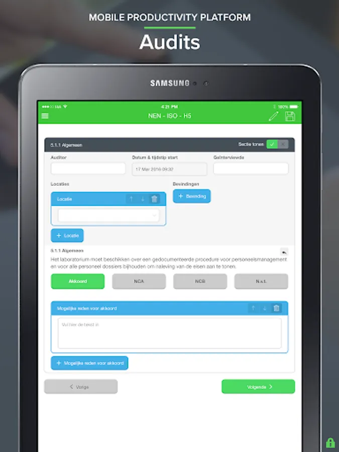 Inspect4All gives a clear overview in situations, at all levels of your organization. Professional companies in diverse sectors like property management, maintenance, engineering, construction and health care use Inspect4All. Inspect4All is suitable for all kinds of forms, such as real estate forms, health care forms, construction forms, installation forms, etc. Also, Inspect4All is used for ISO audits, such as ISO 9001, ISO 27001 and ISO 15189.