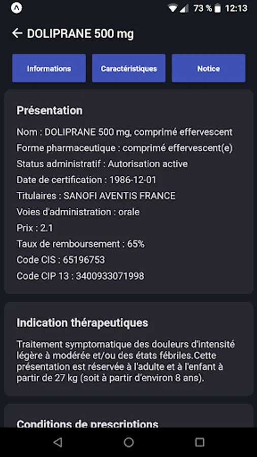Thus, for a drug, you will have the possibility to access its leaflet, its substances, its various characteristics, etc.
