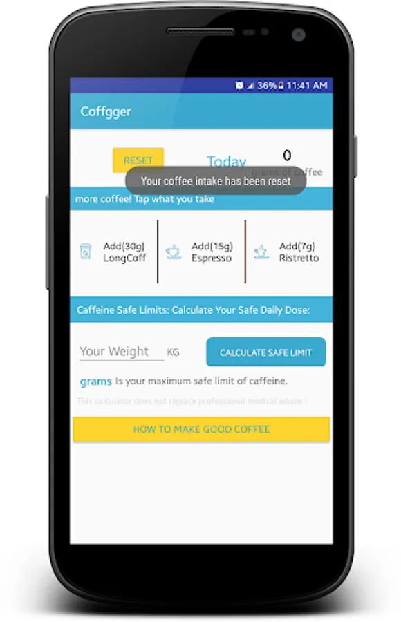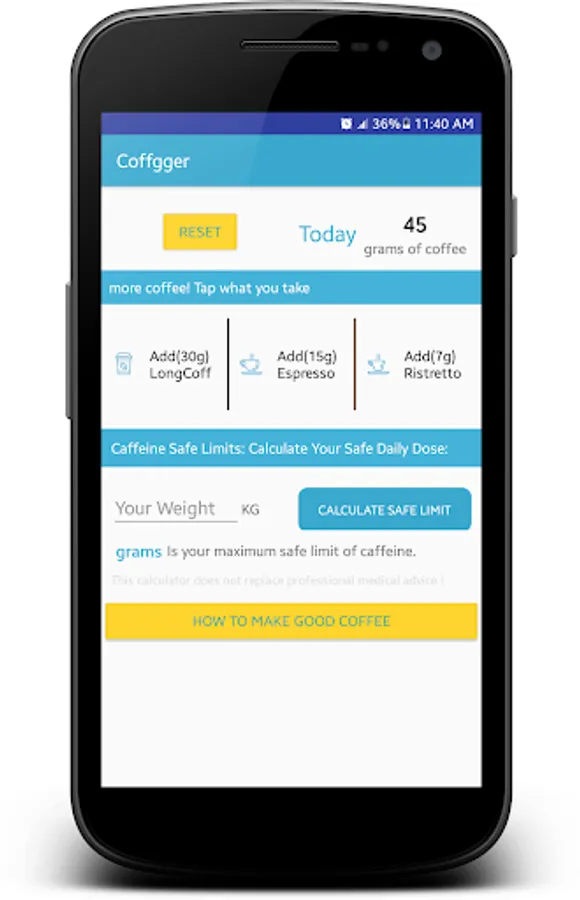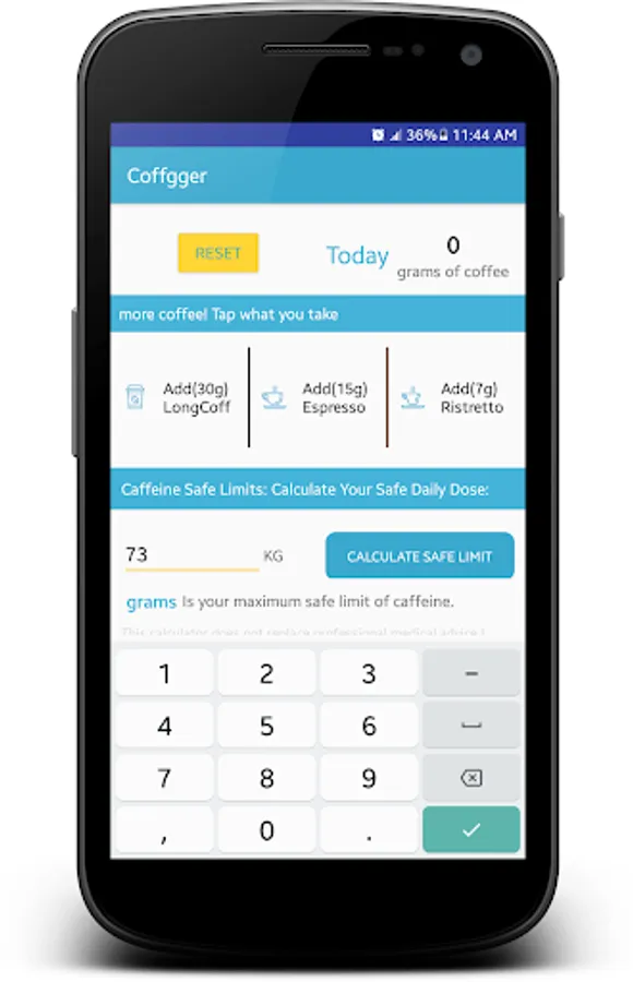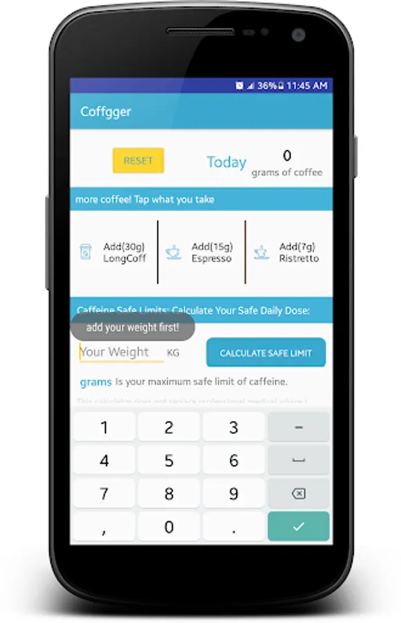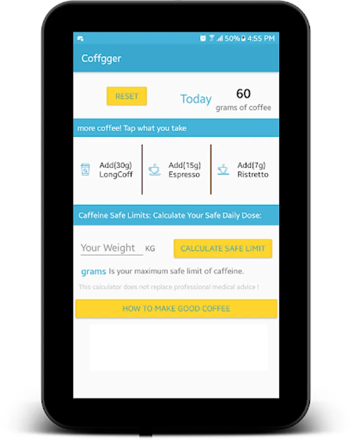 5 -Coffgger | coffee logger & caffeine Calculator contains a useful calculator for the amount of caffeine allowed scientifically based on your weight as this is considered a scientific consultation, But this calculator does not replace professional medical advice.
