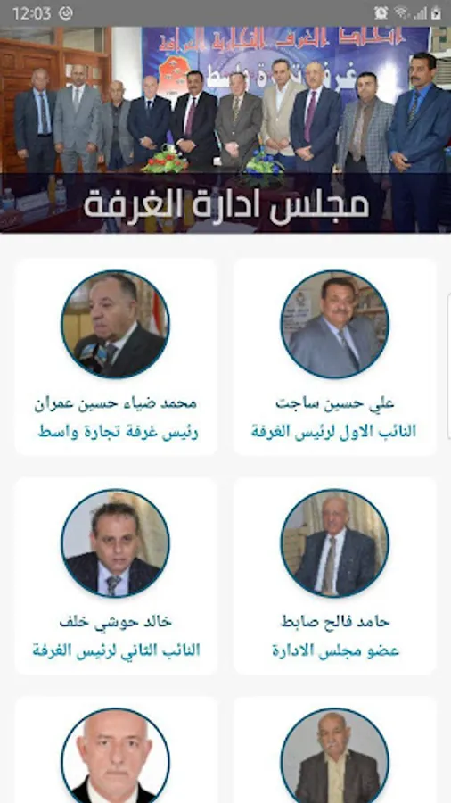This section reviews the president and members of the Wasit Chamber of Commerce and includes a picture of each individual in addition to his position.