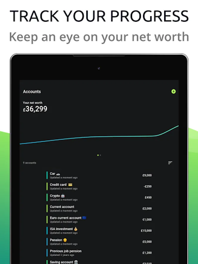If you're like me, you might have a few accounts, sometimes with different currencies. Maybe even, some of them you haven't looked at for a while, like an old pension account open by your first employer a few years back? If that's the case, worth it is perfect for you, it will allow you to keep an eye on what you have, what you owe while keeping it up to date.