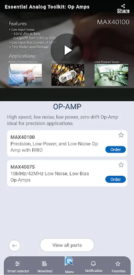 Quickly find the analog ICs you need for your designs. Select parts based on critical semiconductor specs; order parts, samples, and eval kits; watch short videos, access datasheets, and get the latest on new products, webinars, and promos. Get Essential Analog IC insights on the go!