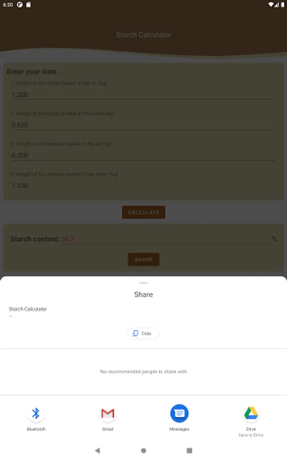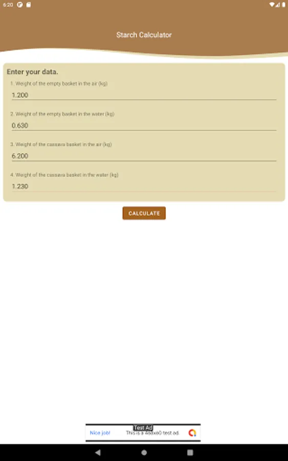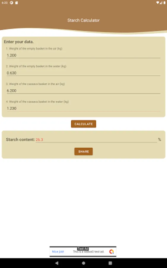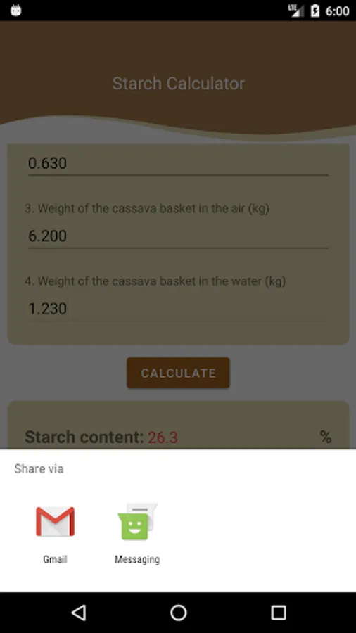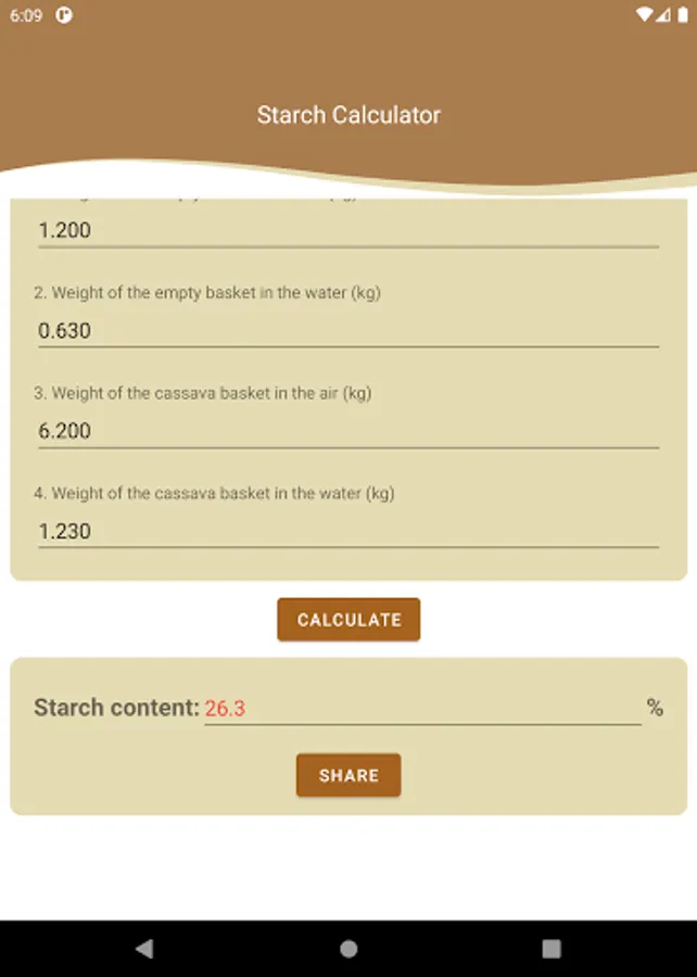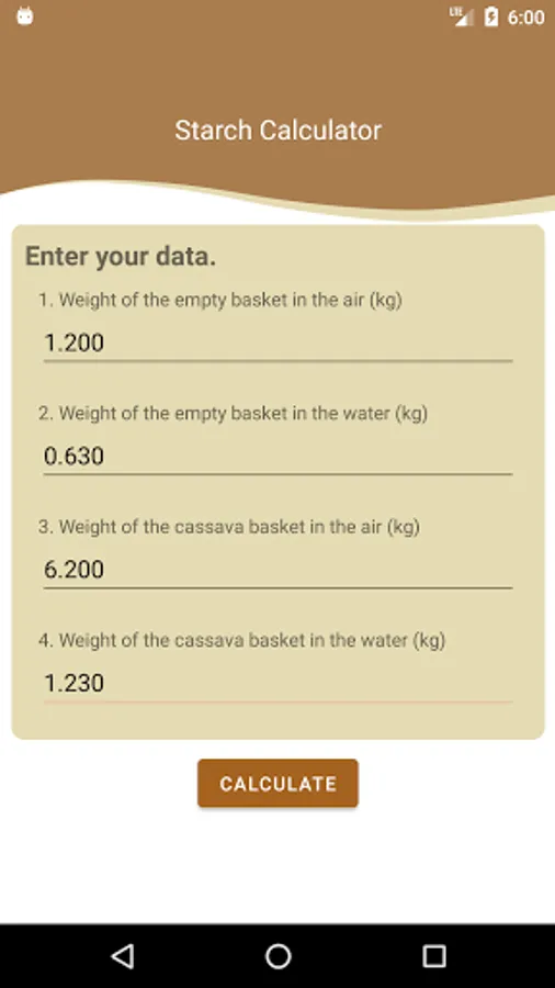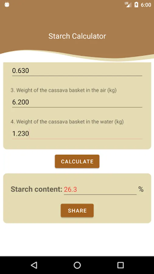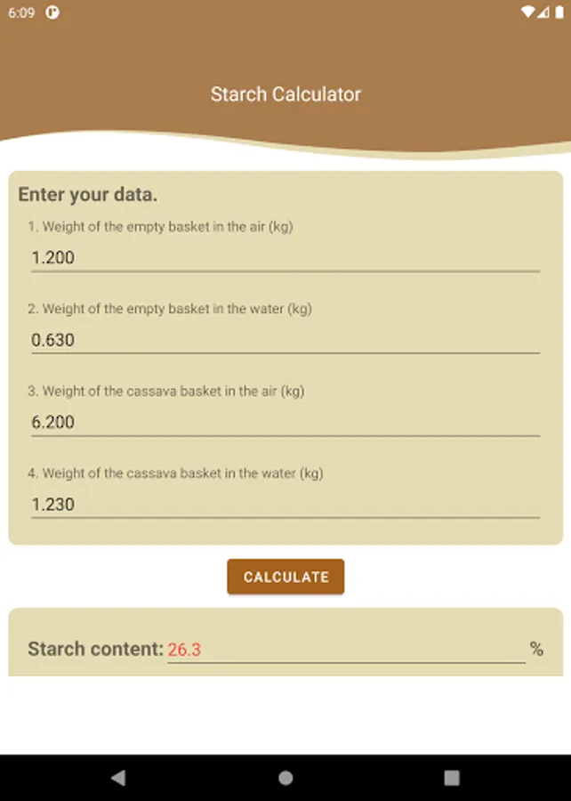 It can help you to calculate the starch content in cassava. Please read an instruction inside the app for more detail.