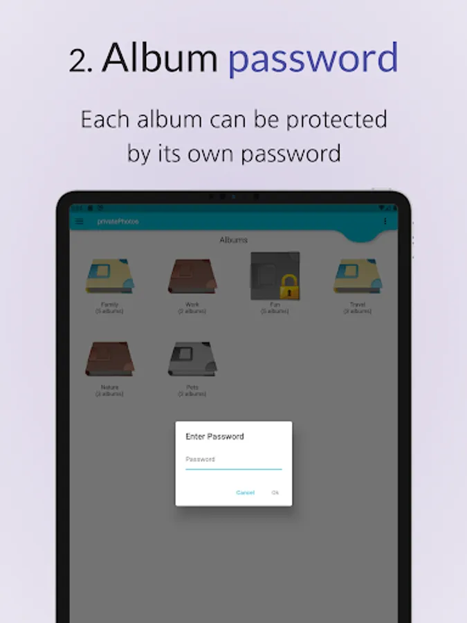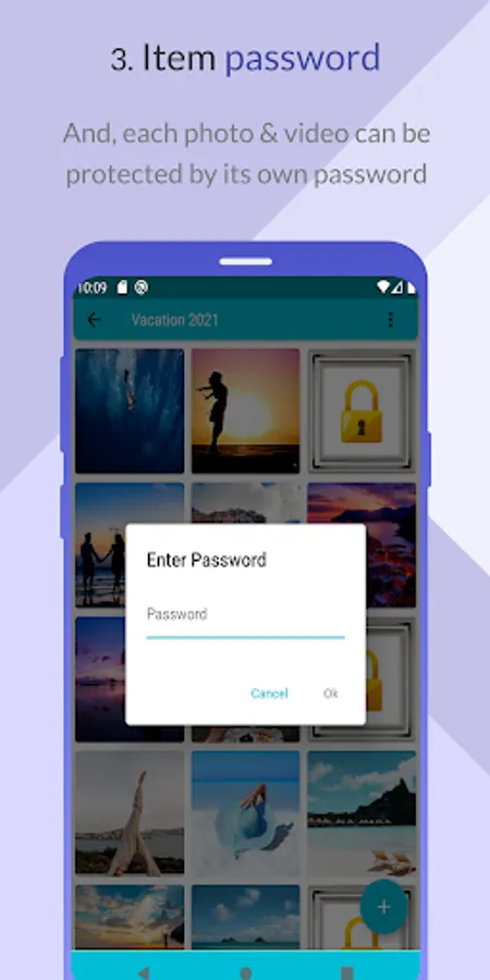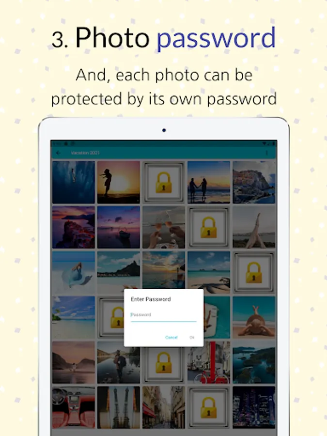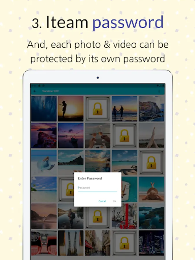 - individual photo/video/file level - by allowing to protect photo, video or file by its own password.