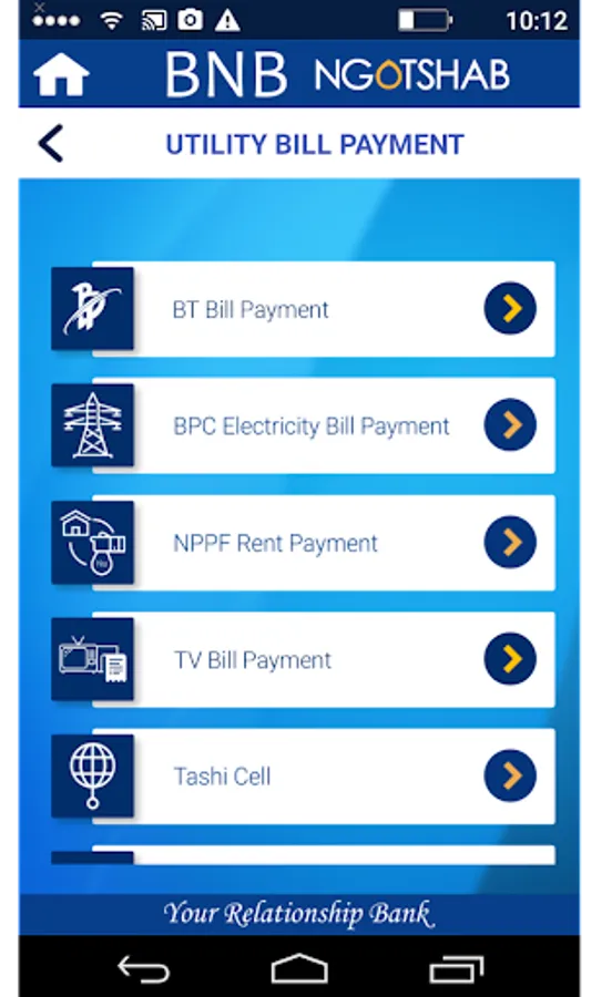 4. Utility Bill Payments for BPC Electricity Bill Payment, NPPF Rent payment, DrukCom TV Bill payment, Etho Metro TV Bill payment, TashiCell – Postpaid/Leased Line and so on.