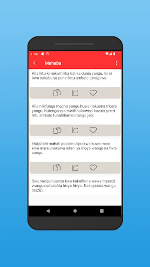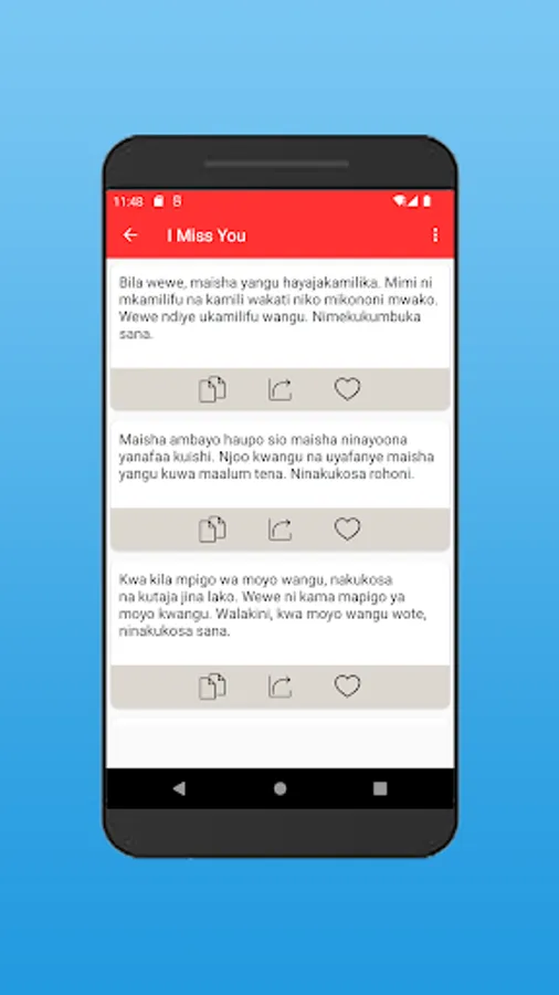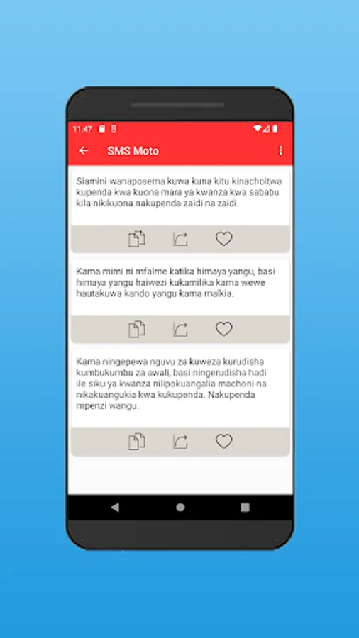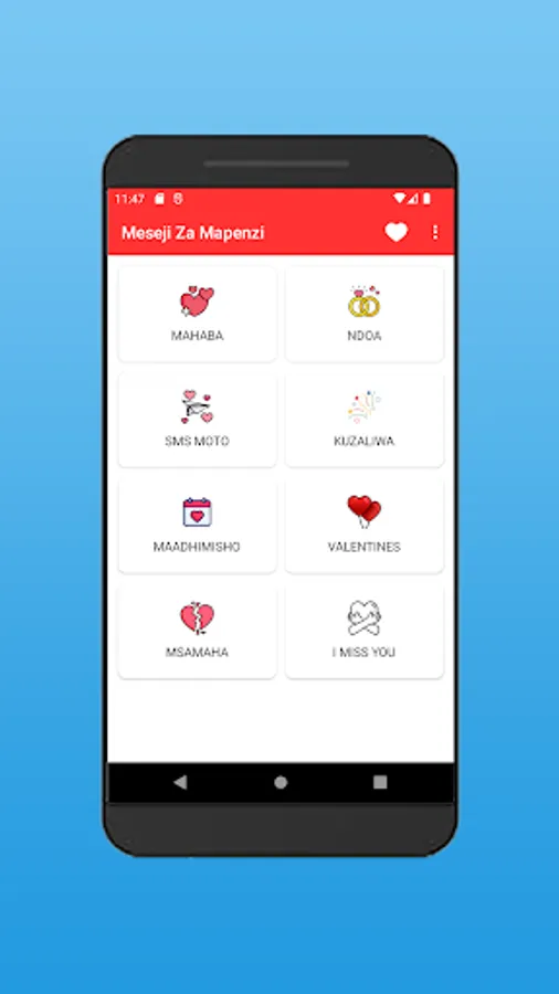 Pata sms moto za mapenzi za kiswahili. Ikiwa una mchumba ambaye ungependa kumwambia maneno matamu ya kumfurahisha, basi utazipata kwenye app hii. Ukitaka kumwandia maneno mazito yenye mapenzi ya kila aina. Ikiwa unataka meseji za kumbukumbu ya siku mliopatana au ya ndoa, app hii iko sms kamili ya kumwandikia mpenzio. Kuna sms za siku ya kuzaliwa pia, meseji ya kumwandikia mpenzi wako kwa siku aliyozaliwa. Isitoshe, Kuna meseji tamu za kumwandikia mpenzio iwapo mmekosana, sms hizo zitampea maana ya kukusamehe. Ukitaka kumwambia mwenzio jinsi unavyomkosa, basi tunazo hizo meseji kwa wingi.