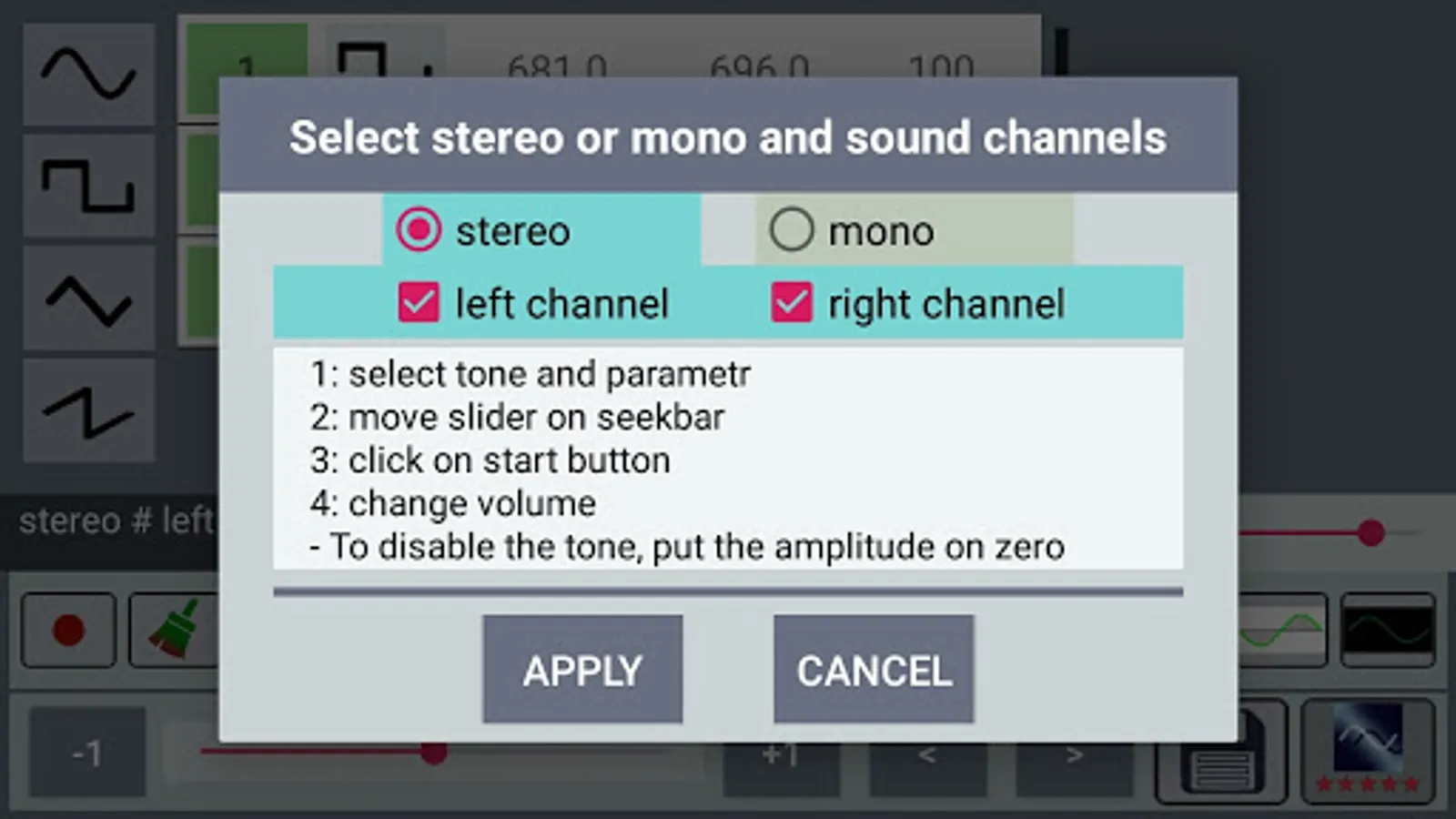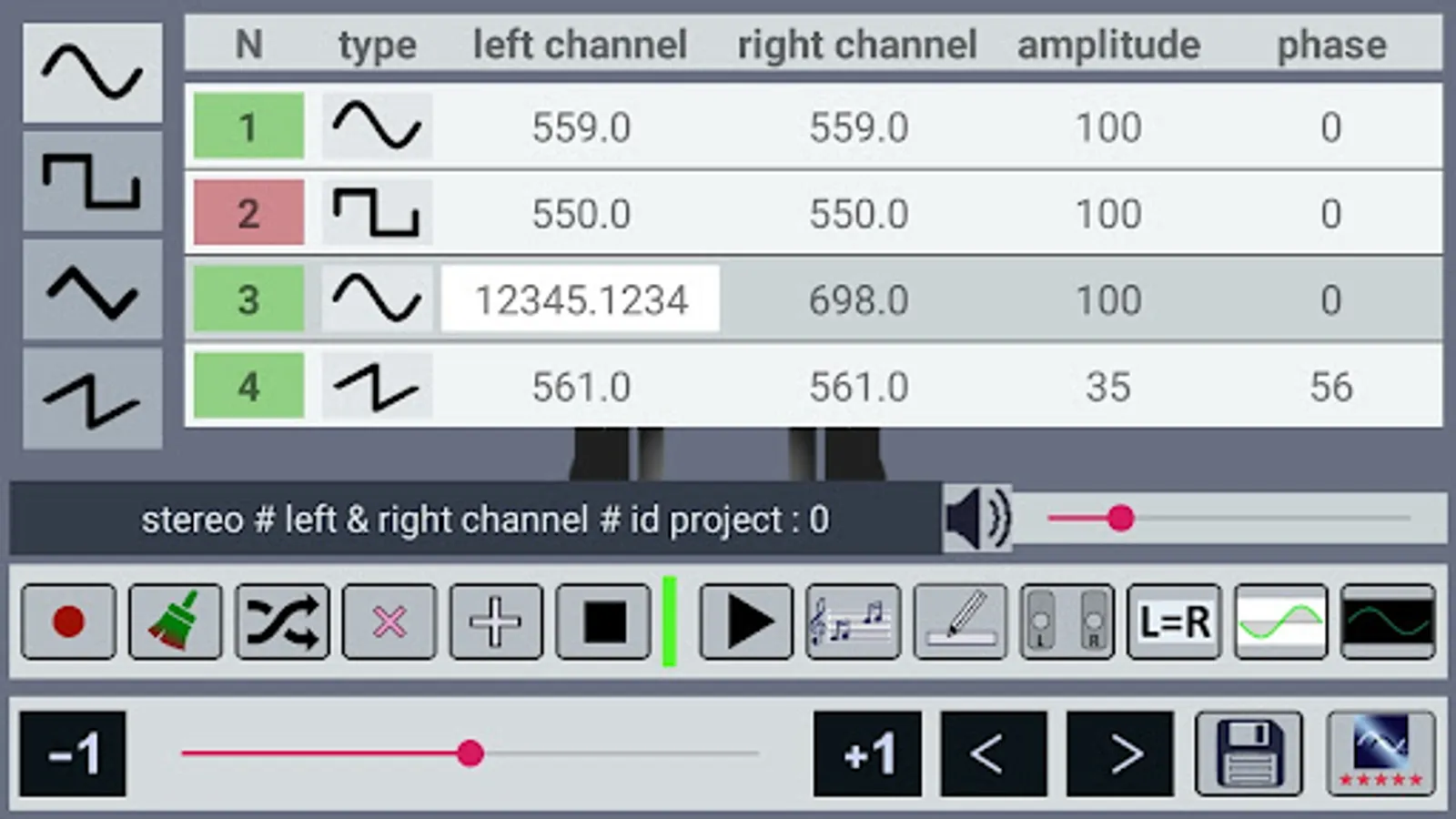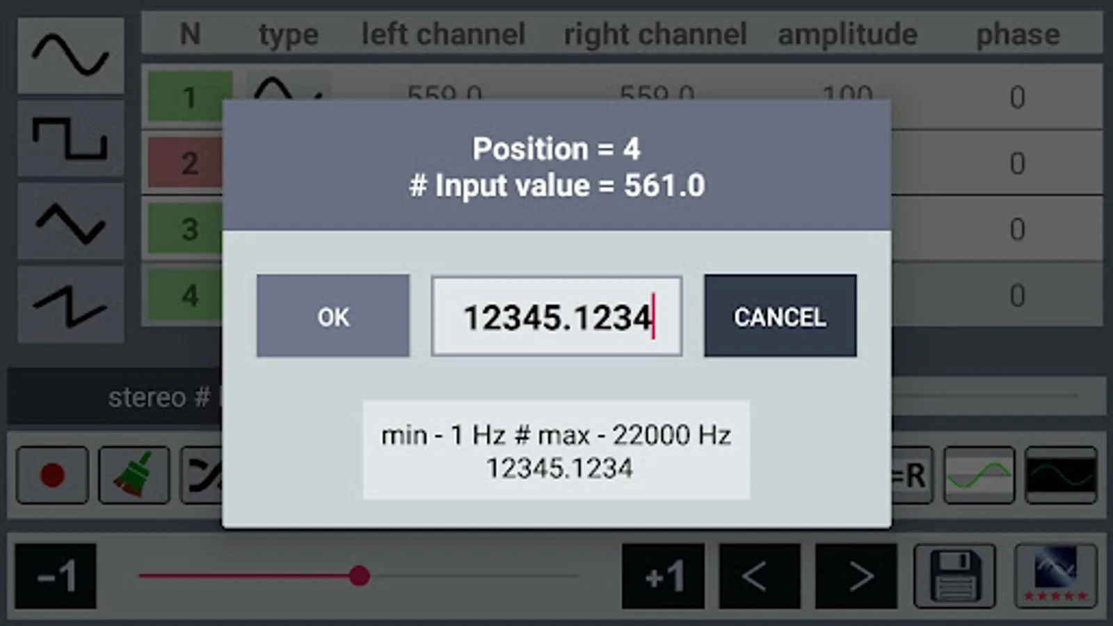 Frequency Stereo Sound Generator, generate a tone with a frequency between 1 Hz and 22000Hz on your smartphone.