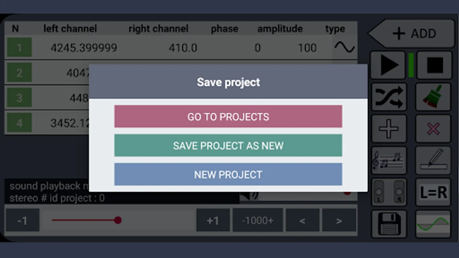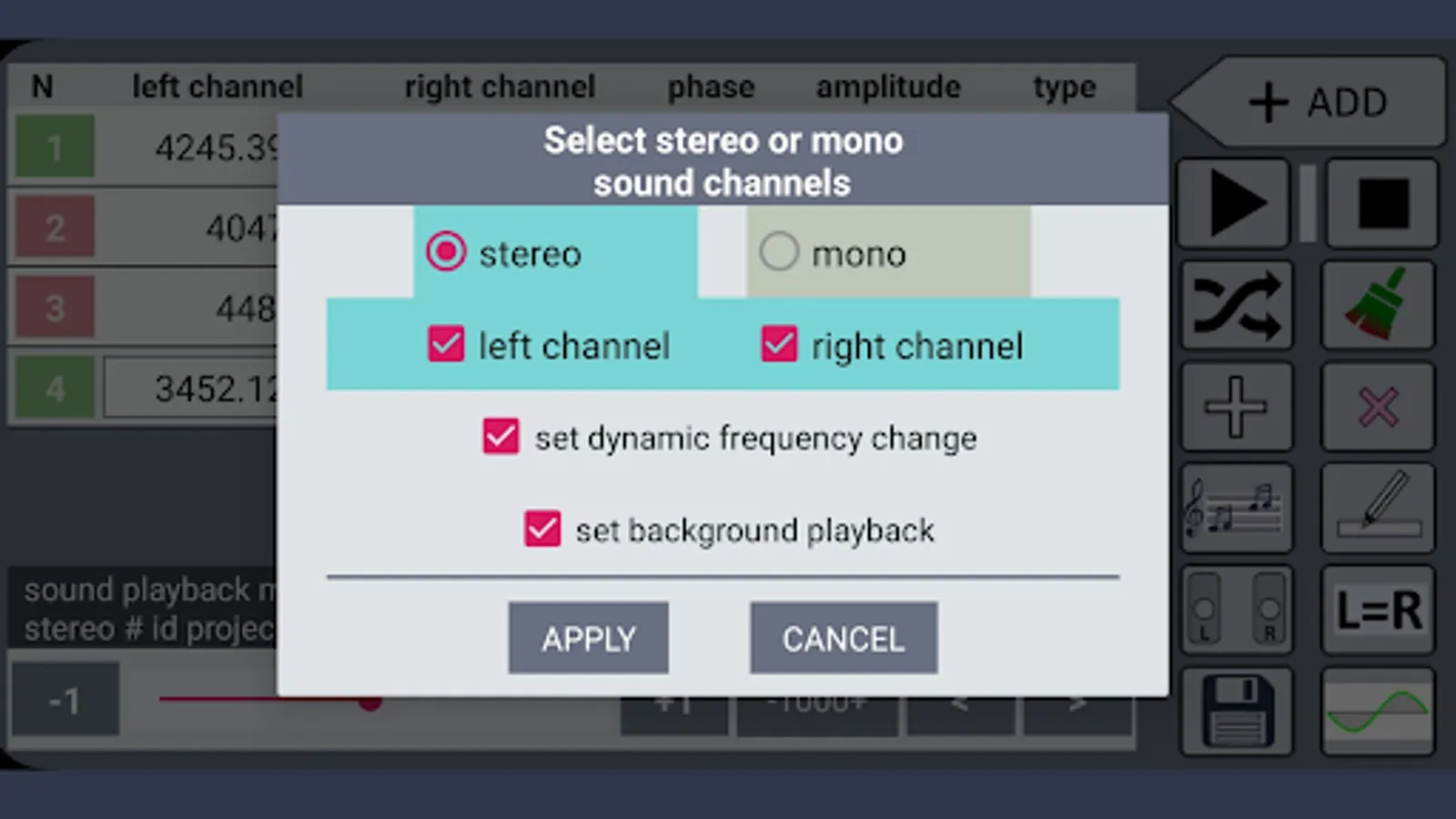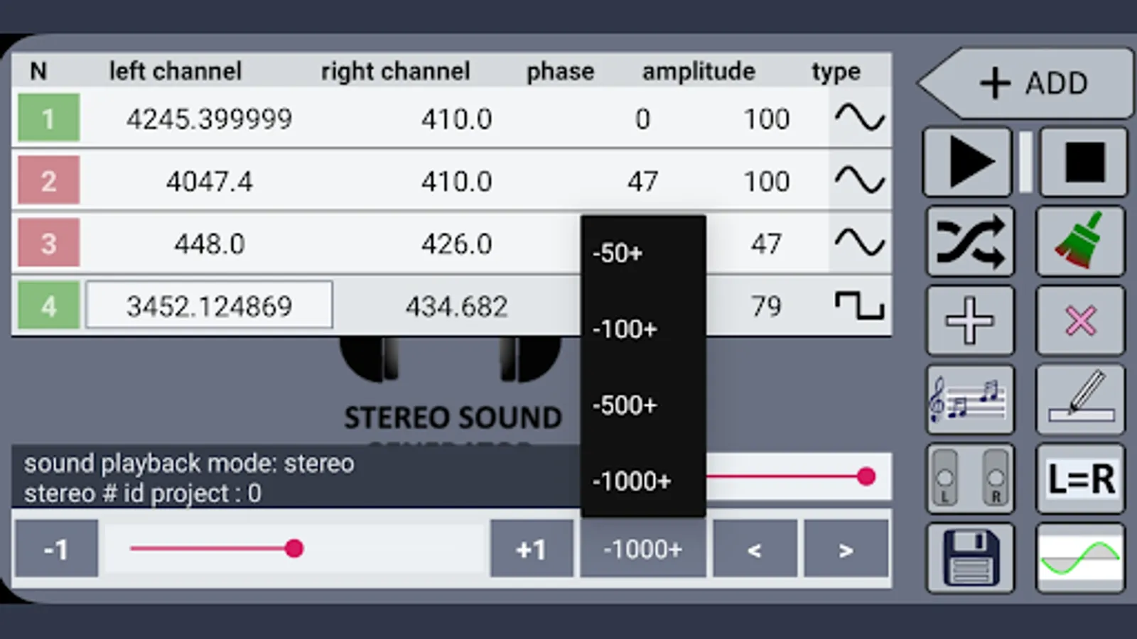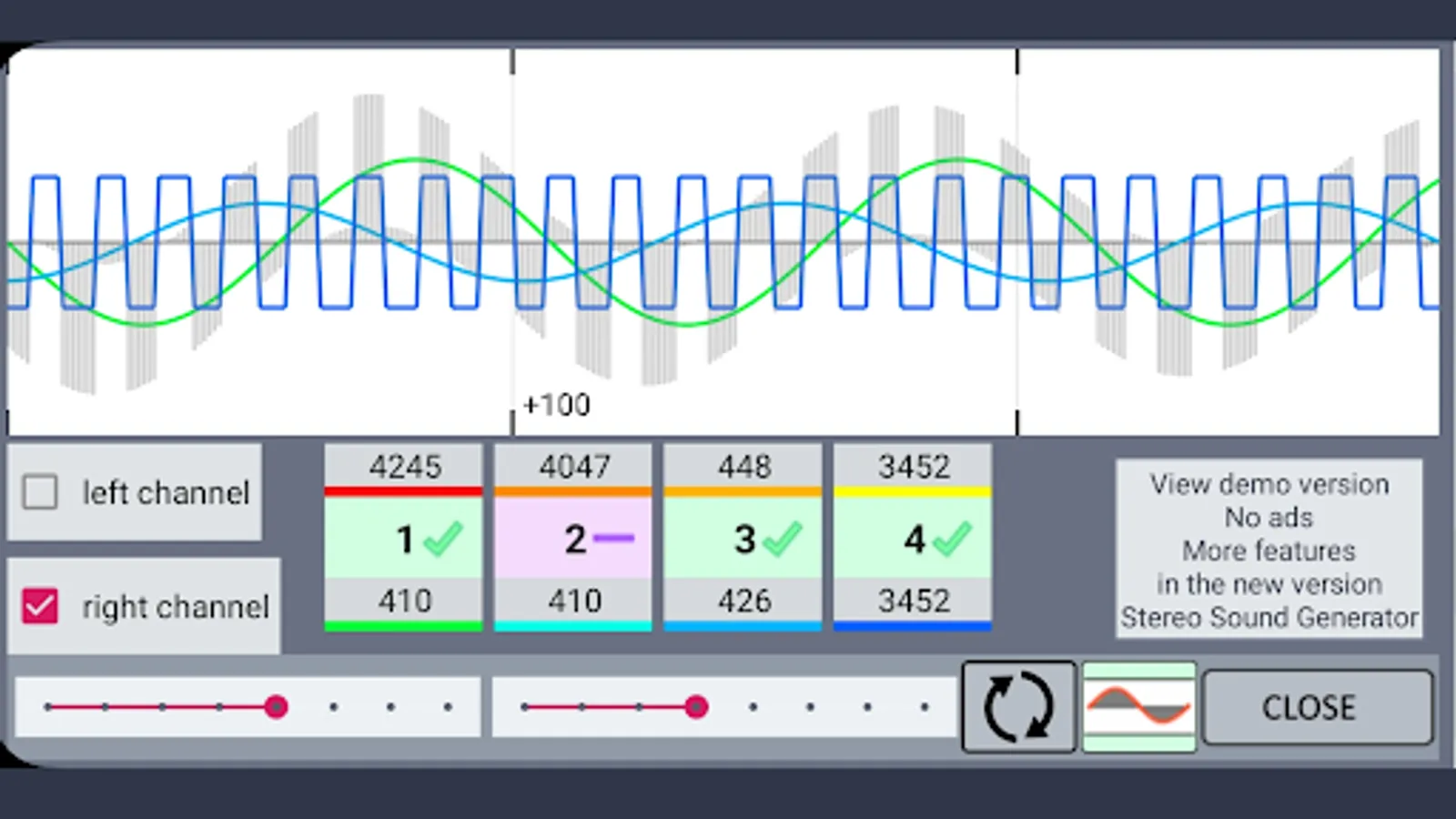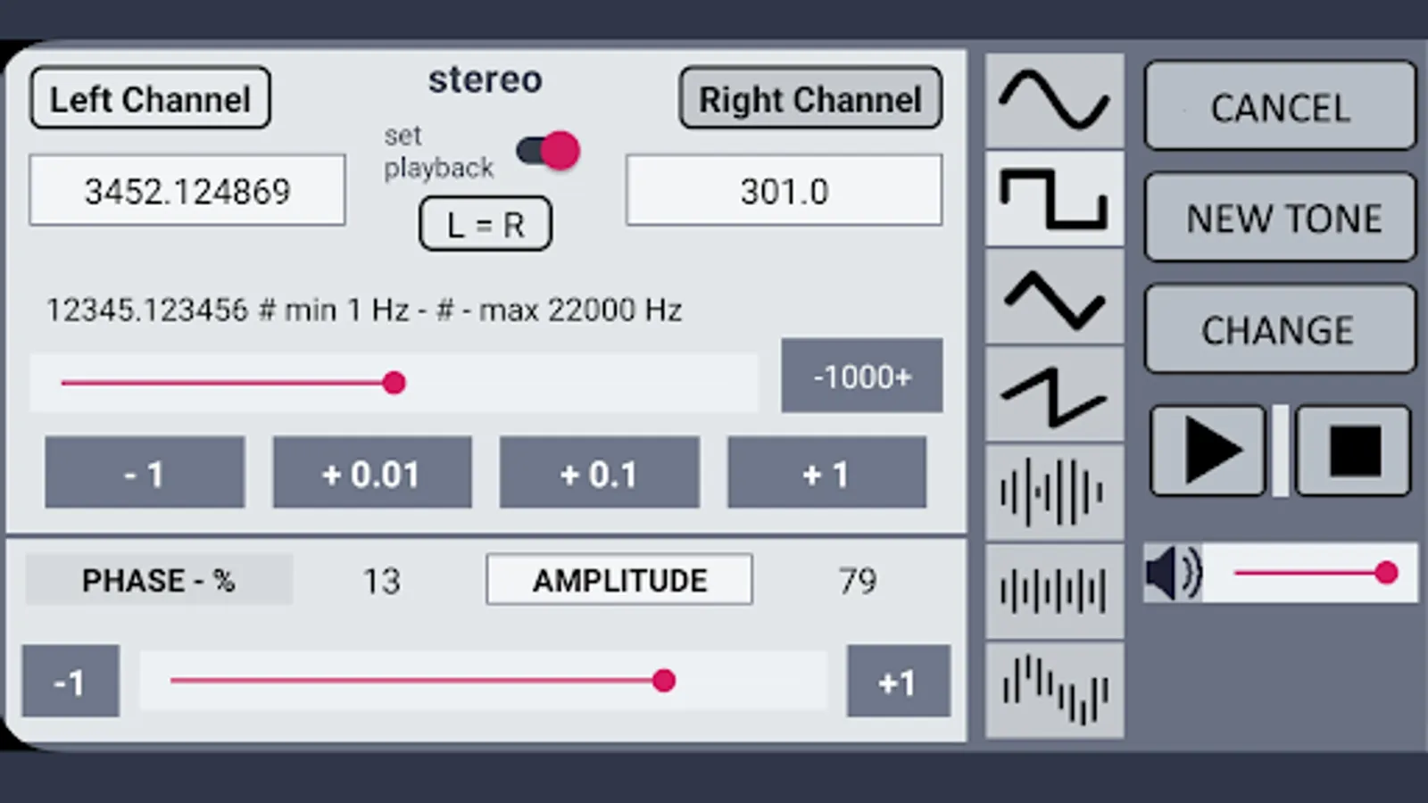 Frequency Generator is a stereo player with two sound playing channels. In it you can switch the left or right channels without stopping the sound. Go from stereo to mono sound.