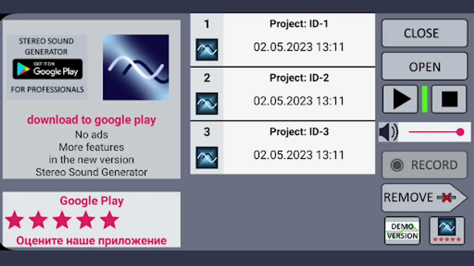 Easily adjust the frequency of sound generation by dragging slider. Use buttons - and + for additional configuration accuracy. In addition, adjust the volume of the generated sounds in the range from 0 to 100%.