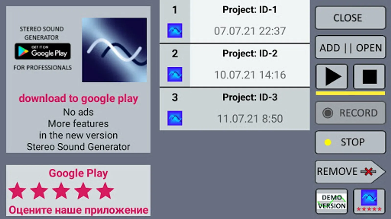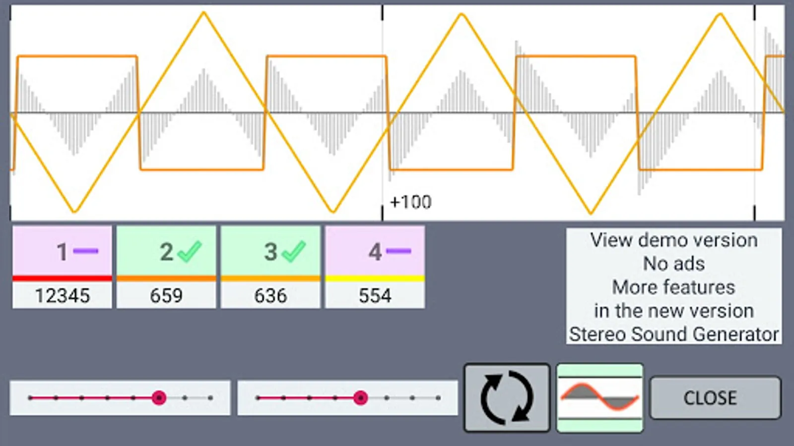 Frequency Generator is a stereo player with two sound playing channels. In it you can switch the left or right channels without stopping the sound. Go from stereo to mono sound.
