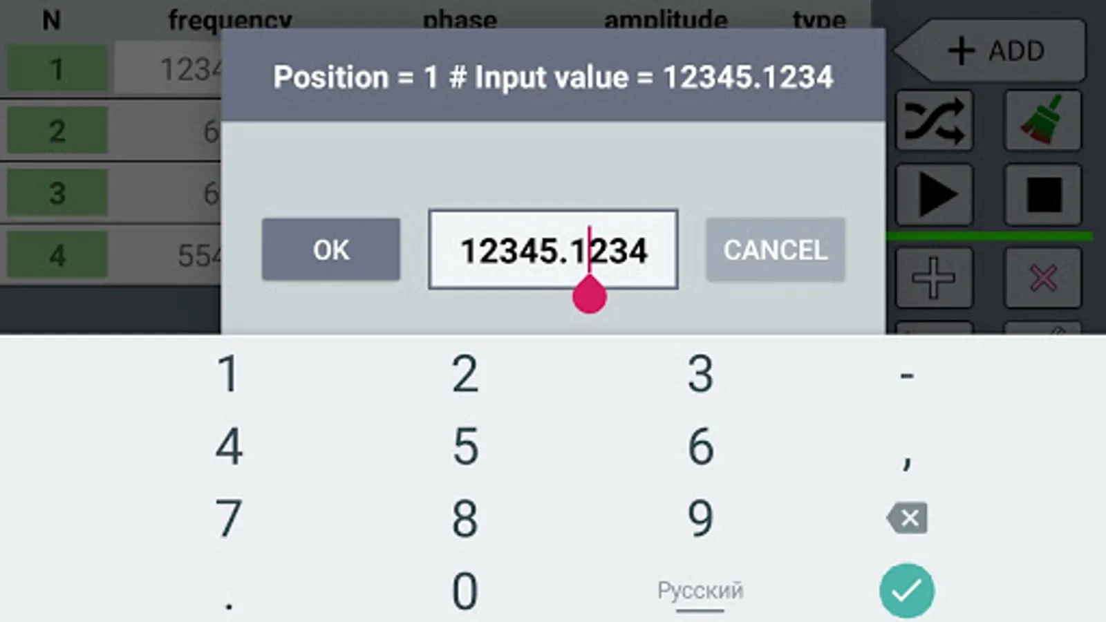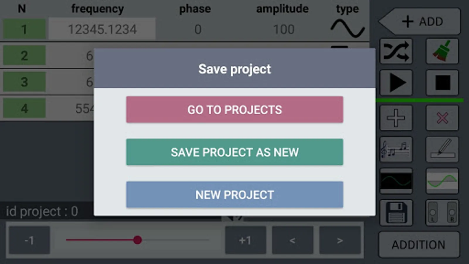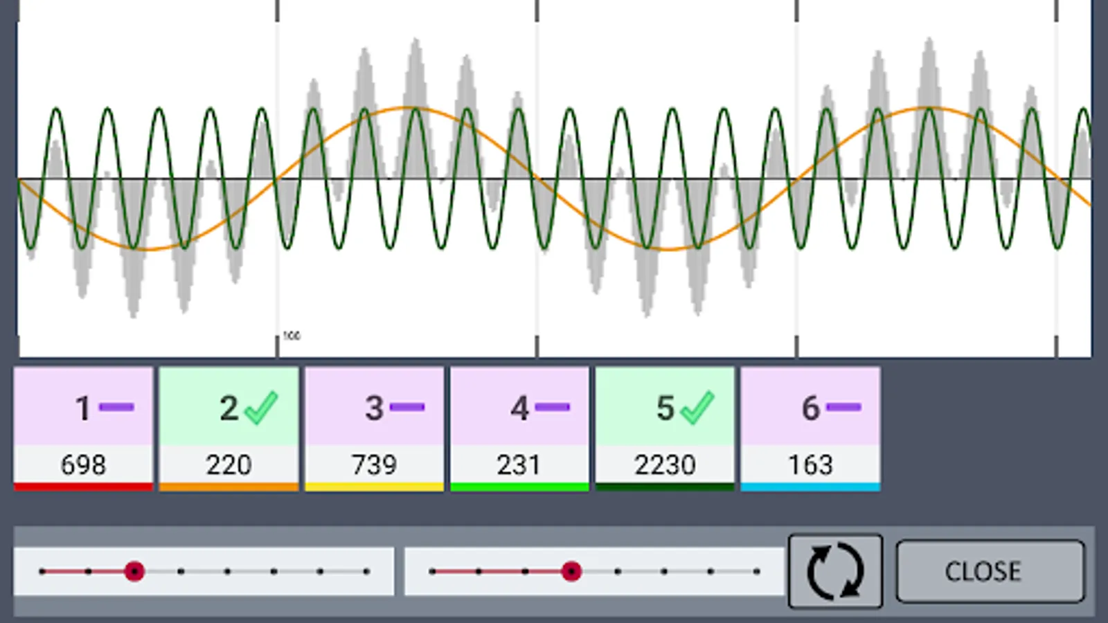 The program has a graphic representation of frequencies and their addition. Visually observe the frequency.. Turn on the square or triangular signal shape.