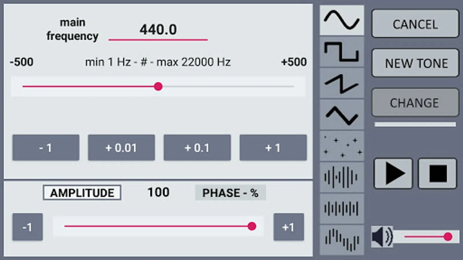 Easily adjust the frequency of sound generation by dragging slider. Use buttons - and + for additional configuration accuracy. In addition, adjust the volume of the generated sounds in the range from 0 to 100%.
