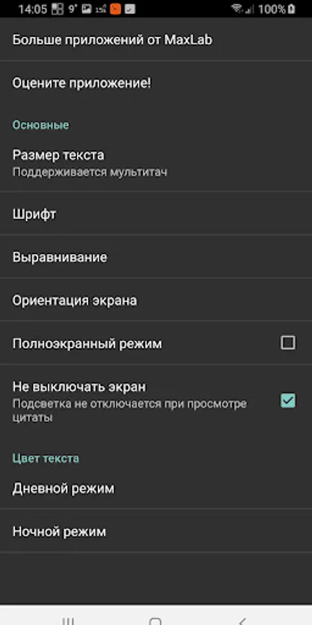 ♦ Move between quotes by gestures left and right, multitouch function - scaling text.