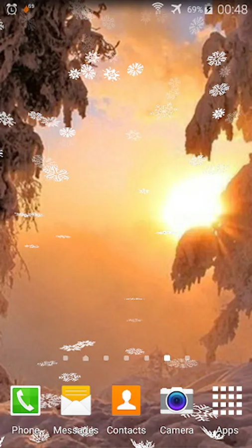 Snowflakes packs: standard (white snowflakes), natural. Few backgrounds, cameras. There an opportunity of choosing multiple packs of snowflakes falling together, choosing speed and count of snowflakes. Disappearing and deflating mode, deflating of laying snowflakes by shaking and gestures.