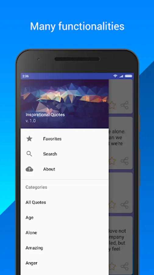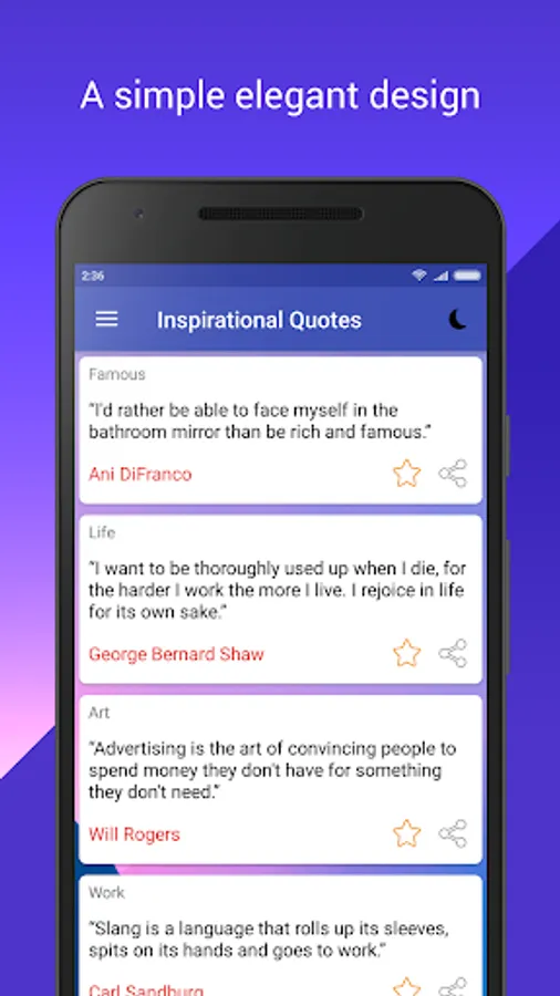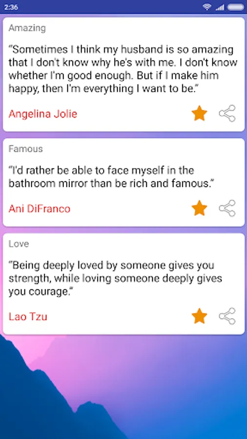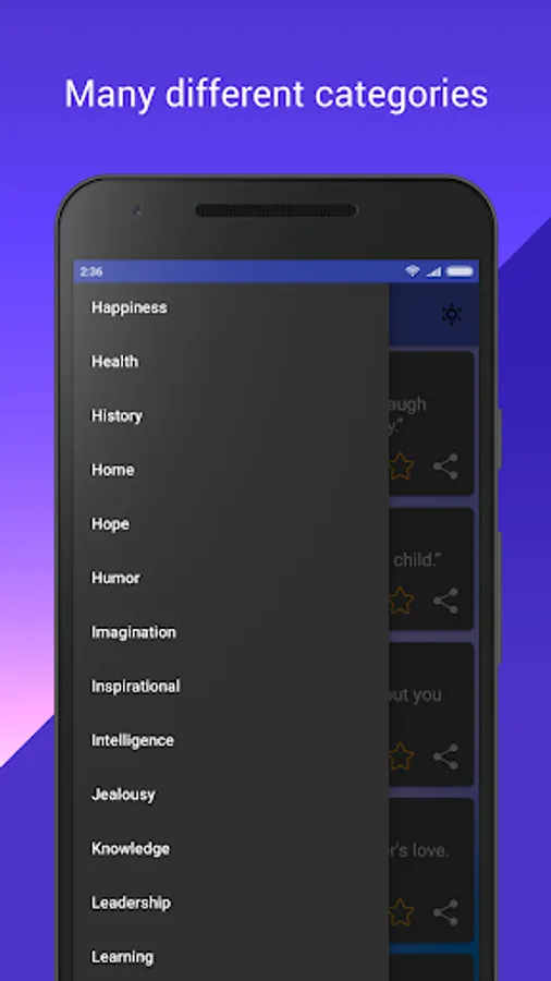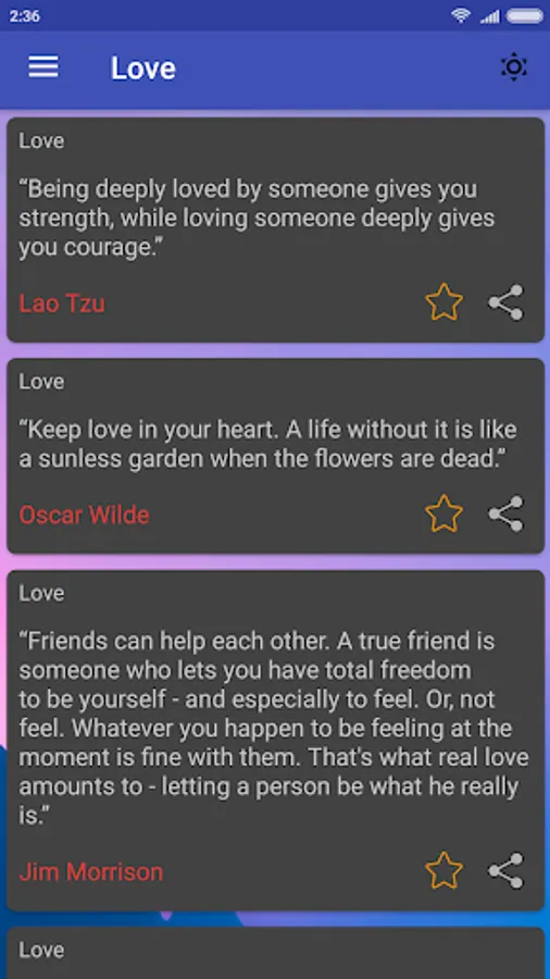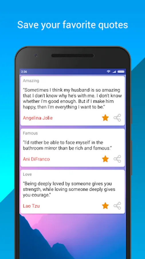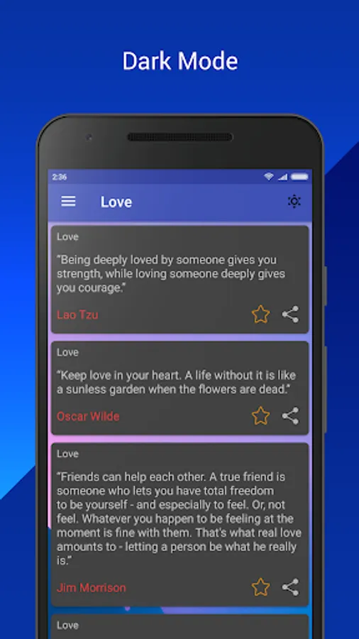 Inspirational Book Quotes is a lightweight application containing more than 70 000+ Quotes and Sayings from 100+ categories like Love, Life, Friendship, Motivation, Happiness, Imagination, Success, Experience, Truth, Dreams, Birthday..