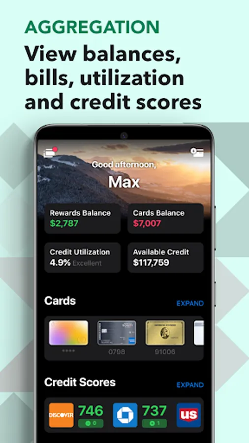 • Provides a comprehensive view of your rewards, cashback offers, current balances, credit limits, credit score performance, and credit utilization