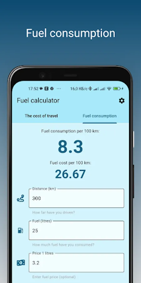 Fuel Consumption Calculator: Determine your vehicle's fuel consumption based on the amount of fuel used and the distance traveled. This feature helps you monitor your vehicle's fuel efficiency and manage your fuel expenses better.
