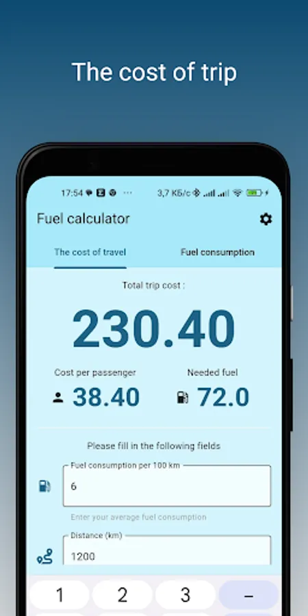 Trip Cost Calculator: Calculate the total cost of your trip based on the distance to be traveled, your vehicle's fuel consumption, fuel price, and the number of passengers. Simply input the necessary data, and the app will provide you with the total cost and the cost per passenger.