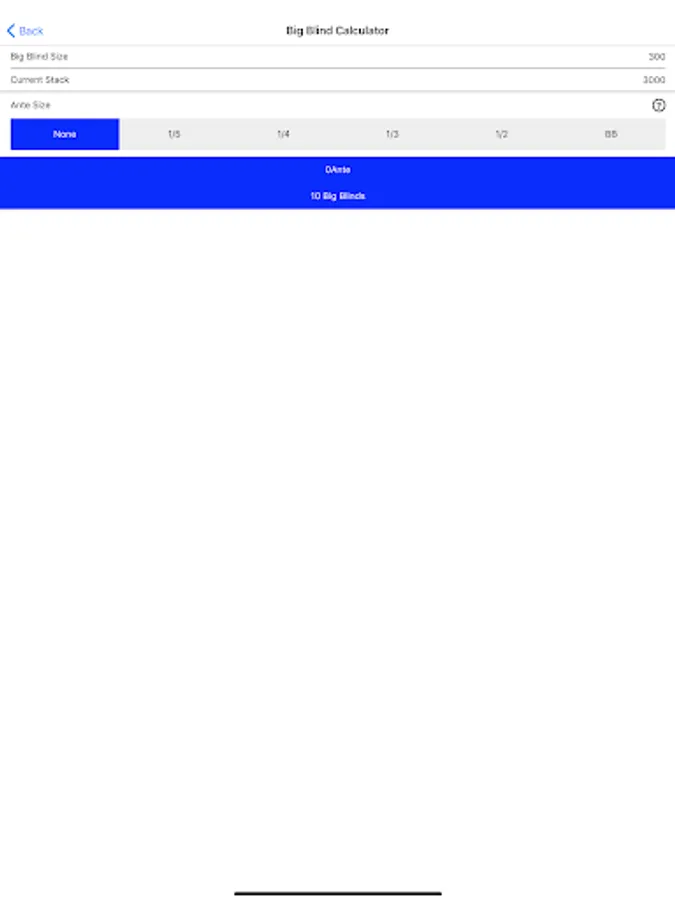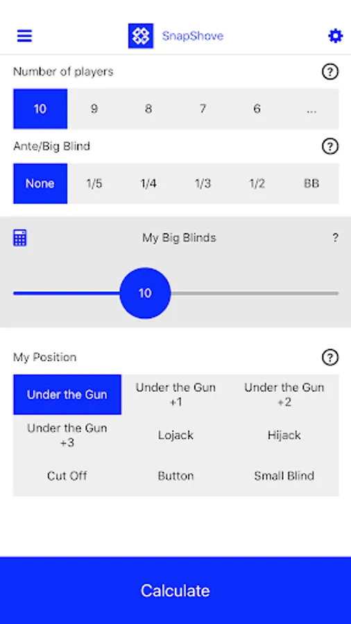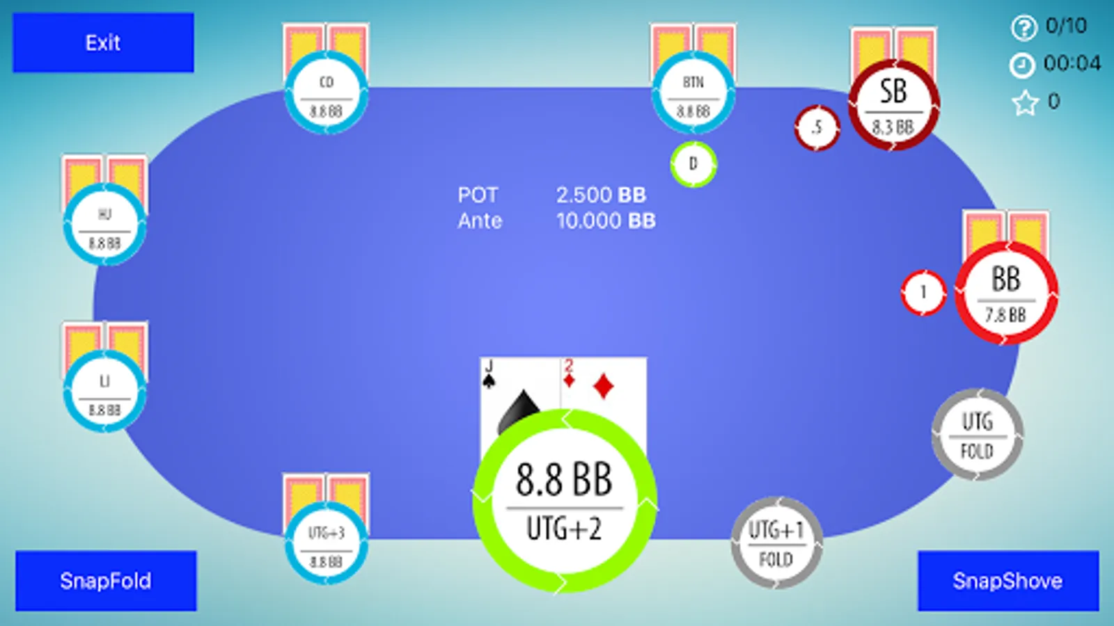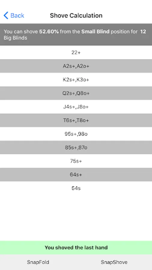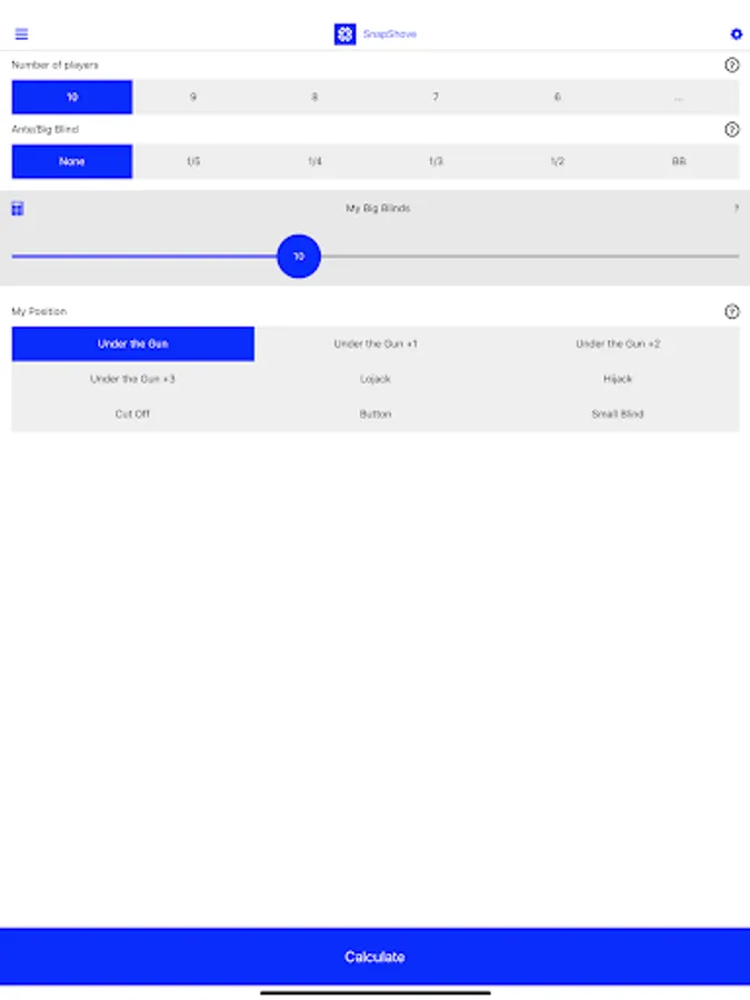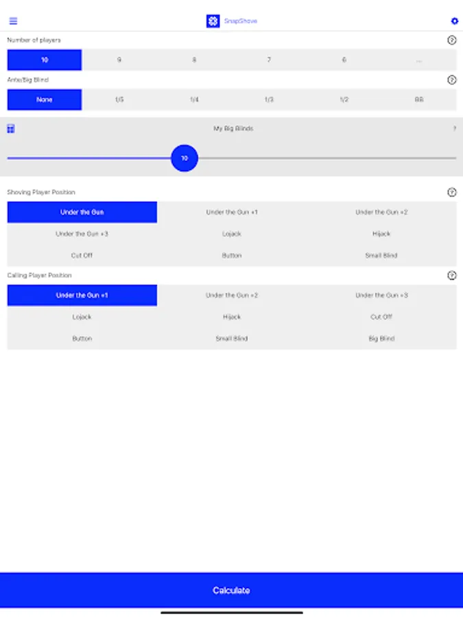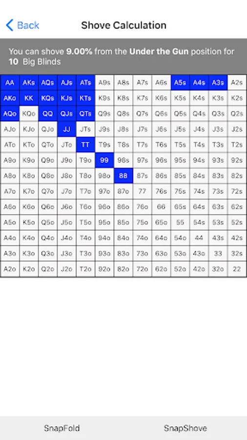 • SnapShove Pro offers even more precise calculations with a wider range of options for player numbers, antes and big blind increments