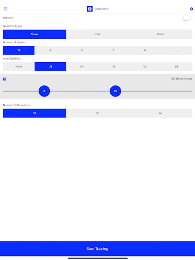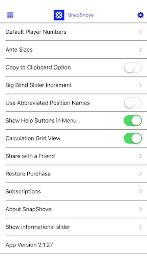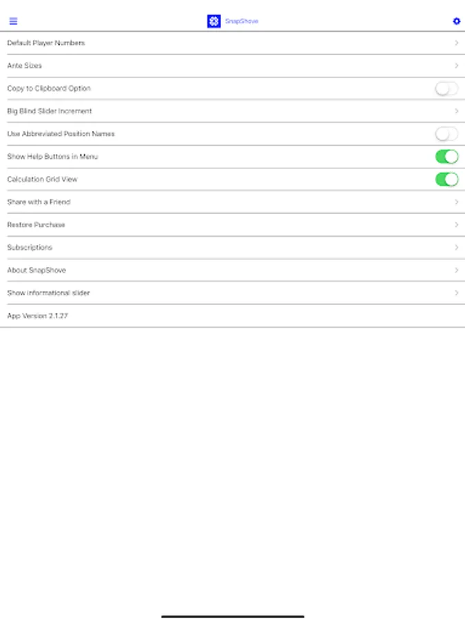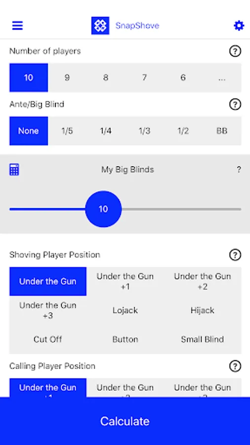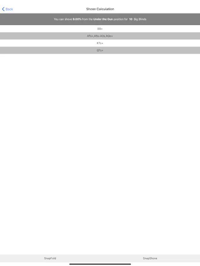 • SnapShove Pro offers even more precise calculations with a wider range of options for player numbers, antes and big blind increments