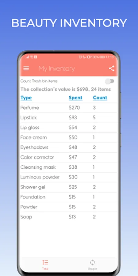 Beautistics will collect and show you the statistics about your collection: prices and spending, amount of bought and finished products during different time periods, it will also show you the most crowded categories of your collection.